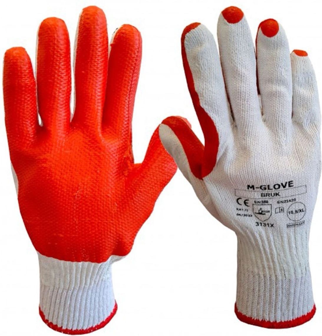 Rękawice brukarskie, roz. 10 Rękawice robocze z mieszanki bawełny i poliestru, powleczone trwałym lateksem i podwójnie pokryte wulkanizowaną gumą w kolorze pomarańczowym. Charakteryzują się wysoką odpornością na ścieranie, przetarcia i rozdarcia, co sprawia, że idealnie nadają się do prac takich jak układanie kostki brukowej.