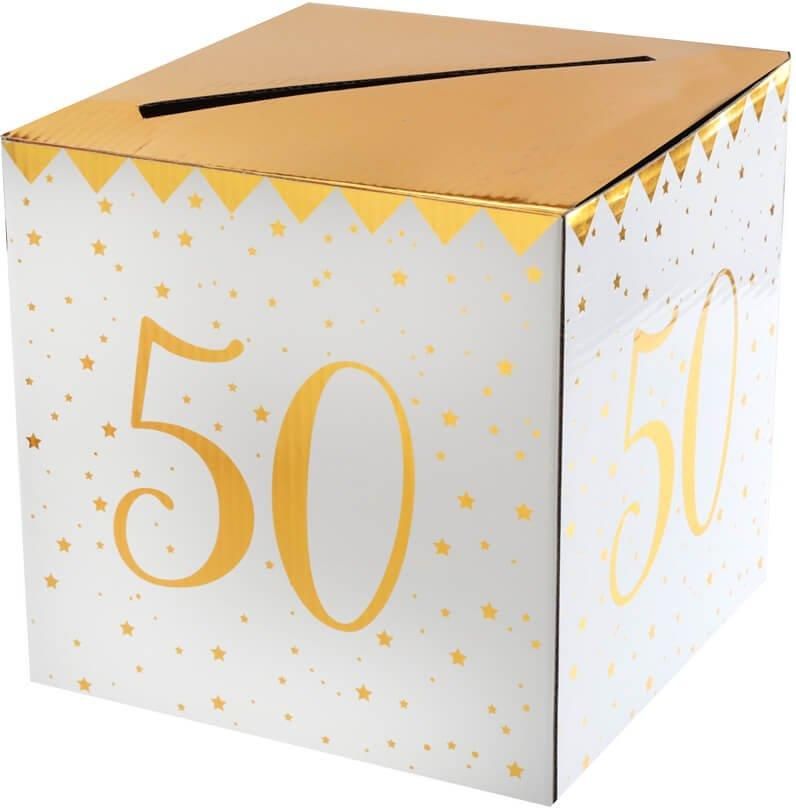Pudełko na koperty z życzeniami, prezentami białe ze złotym nadrukiem 50. Idealne na pięćdzuesiąte urodziny lub Złote Gody. Wymiary po złożeniu: 20 cm x 20 cm x 20 cm. Opakowanie: 1 szt.