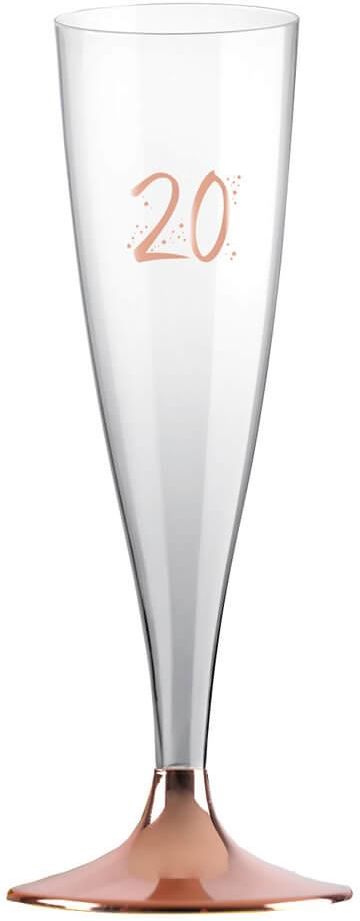 Kieliszki do szampana na dwudzieste urodziny różowe złoto - 140 ml - 6 szt. Kod produktu: S7343-20 Przezroczyste kieliszki do szampana z nadrukiem cyfry 20 w kolorze różowego złota, idealne do wzniesienia toastu na dwudziestych urodzinach. Wykonane z polistyrenu. Pojemność: 140 ml. Opakowanie: 6 szt.