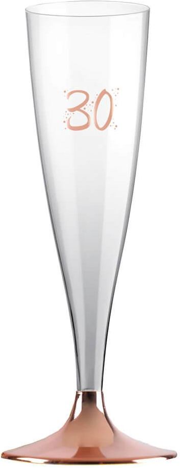 Kieliszki do szampana na trzydzieste urodziny różowe złoto - 140 ml - 6 szt. Kod produktu: S7343-30 Przezroczyste kieliszki do szampana z nadrukiem cyfry 30 w kolorze różowego złota, idealne do wzniesienia toastu na trzydziestych urodzinach. Wykonane z polistyrenu. Pojemność: 140 ml. Opakowanie: 6 szt.