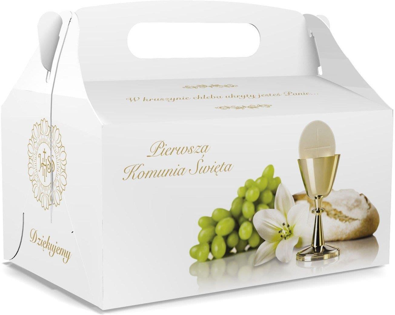 Ozdobne pudełko na ciasto komunijne. Wymiary: dł. 17 cm, szer. 12 cm, wys. 8,5 cm. Produkt posiada atesty do kontaktu z żywnością. Istnieje możliwość wkładania ciasta od boku. Pudełka są wykonane z trwałego kartonu o podwyższonej odporności na wilgoć.