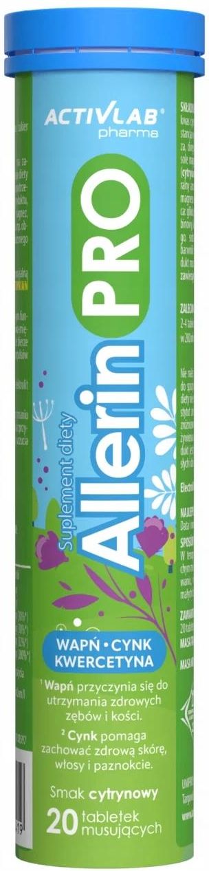 ACTIVLAB Allerin PRO 20 tab smak: cytryna Dlaczego warto sięgnąć po ACTIVLAB Allerin PRO 20 tabletek? Kompleksowe wsparcie dla kości, skóry, włosów, paznokci i odporności. Zawiera kluczowe składniki: wapń, cynk i kwercetynę. Wapń wspiera zdrowe kości i zęby. Cynk pomaga w utrzymaniu zdrowej skóry, włosów i paznokci. Kwercetyna wspiera układ odpornościowy. Wygodna i smaczna forma cytrynowych tabletek musujących. Sprzyja szybkiej przyswajalności składników aktywnych. ACTIVLAB Allerin PRO 20 tabletek – opis produktu Allerin PRO to suplement diety dostępny w formie cytrynowych tabletek musujących, opracowany z myślą o dorosłych, którzy chcą kompleksowo zadbać o swoje zdrowie. Dzięki połączeniu wapnia, cynku i kwercetyny, produkt pomaga utrzymać mocne kości i zdrowe zęby, wspiera wygląd skóry, włosów i paznokci, a także wspomaga naturalną odporność organizmu. Dzięki wygodnej i przyjemnej w stosowaniu formie, codzienne przyjmowanie suplementu staje się łatwe i przyjemne, a szybko działające składniki zapewniają ich skuteczne wykorzystanie. Dla kogo przeznaczony jest ACTIVLAB Allerin PRO 20 tabletek? Allerin PRO to doskonała propozycja dla osób dorosłych, które pragną troszczyć się o zdrowie i dobre samopoczucie każdego dnia. To idealne rozwiązanie dla tych, którzy szukają wygodnego sposobu na uzupełnienie diety w niezbędne składniki. Jeśli chcesz wzmocnić kości i zęby, zadbać o skórę, włosy i paznokcie oraz wspierać odporność, Allerin PRO zapewni Ci skuteczne wsparcie w łatwo przyswajalnej formie. Informacja żywieniowa, Dzienna porcja (1 tabletka), %* Wapń, 500 mg, 63% Cynk, 5 mg, 50% Kwercetyna, 25 mg, *% referencyjnej wartości spożycia Składniki: Regulator kwasowości: kwas cytrynowy, węglan wapnia, substancja wypełniająca: sorbitol, regulator kwasowości: wodorowęglan sodu, aromat, substancja przeciwzbrylająca: glikol polietylenowy, kwercetyna, substancja słodząca: sukraloza, tlenek cynku, zagęszczony sok cytrynowy w proszku (0,1%). Produkt może zawierać pochodne zbóż zawierających gluten, soi i mleka. Opakowanie: 20 tabletek musujących Porcja dzienna: 1 tabletka Liczba porcji w opakowaniu: 20 dziennych porcji Sposób użycia Zalecana dzienna porcja: 1 tabletka. 1 tabletkę rozpuścić w szklance (200 ml) wody. Przeciwwskazania Suplement diety. Zawiera substancje słodzącą. Nie zaleca się stosowania przez kobiety w ciąży, matki karmiące piersią oraz osoby uczulone na którykolwiek ze składników produktu. Suplement diety nie może być substytutem (zamiennikiem) zdrowego trybu życia. Nie przekraczać zalecanej dziennej porcji. Przechowywanie Przechowywać w temperaturze pokojowej, w suchym i ciemnym miejscu, w zamkniętym opakowaniu, w sposób niedostępny dla małych dzieci. Podmiot odpowiedzialny: UNIPRO Sp. z o.o., Targowisko 553, 32-015 Kłaj DO KAŻDEGO ZAMÓWIENIA OTRZYMUJESZ GRATIS! SM MAGAZYN - VIDEOBOOK W FORMIE ELEKTRONICZNEJ DLA MIŁOŚNIKÓW SPORTU Wywiady z ikonami sportu Treningi z najlepszymi w swojej dziedzinie Diety Poradniki Ciekawostki Robiąc zakupy otrzymujesz nielimitowany dostęp do darmowej prenumeraty SM Magazyn, który wysyłamy do Ciebie w formie elektronicznej po opłaceniu zamówienia. Każdy numer to ponad 80 stron! Otrzymujesz także dostęp do pełnego archiwum! Jesteśmy autorem oraz wydawcą videobooka SM Magazyn. Dzieło zarejestrowane pod ISBN: 978-83-955667-1-4