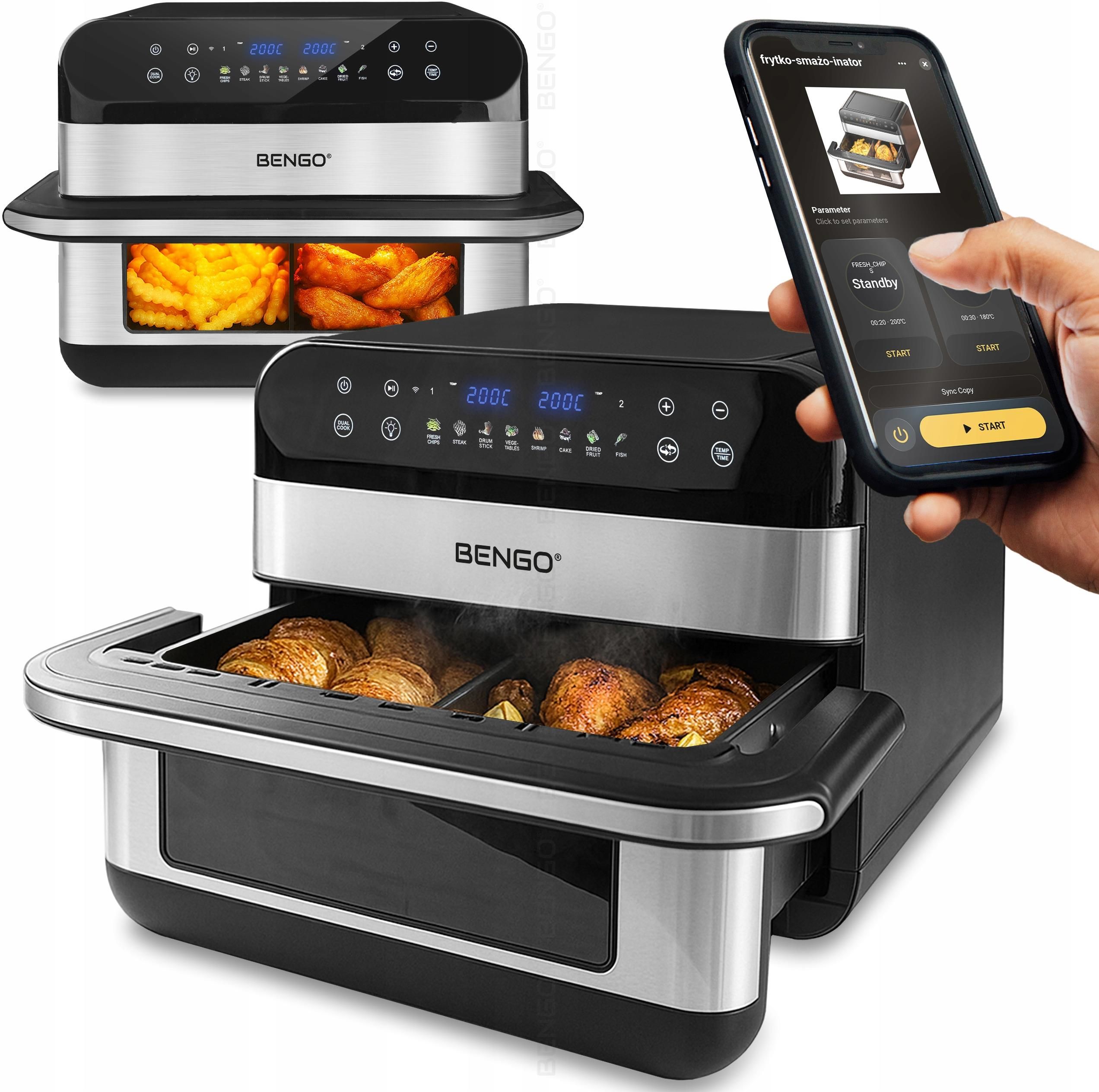 AIRFRYER FRYTKOWNICA BEZTŁUSZCZOWA GRILLOWANIE DUŻA NIEPRZYWIERAJĄCA 10L LED z aplikacją Tuya Smart NOWA GENERACJA!!!! Aż 80% mniej tłuszczu w posiłkach! Nowy wymiar energooszczędności z technologią Warm&Heating! Frytkownica BENGO® została wyposażona w innowacyjny system Warm&Heating, który otwiera przed Tobą zupełnie nowe możliwości przygotowywania potraw. To inteligentne rozwiązanie, stworzone z myślą o wygodzie i efektywności, wykorzystuje algorytmy uczenia maszynowego do monitorowania wybranych programów i automatycznie dostosowuje temperaturę podgrzewania, aby zawsze utrzymać optymalne warunki. Dzięki temu masz pewność, że Twoje potrawy będą idealnie przygotowane, niezależnie od okoliczności! Nowoczesna konstrukcja dla jeszcze lepszego smaku Innowacyjny kształt grzałki zapewnia równomierne i skoncentrowane oddawanie ciepła, co sprawia, że smażone potrawy są perfekcyjnie chrupiące Dwukrotnie wyższy przepływ powietrza w porównaniu do tradycyjnych frytkownic gwarantuje intensywniejsze opiekanie, jednocześnie czyniąc potrawy zdrowszymi i smaczniejszymi Krótszy czas poboru energii oznacza realne oszczędności na rachunkach za prąd oraz bardziej ekologiczne korzystanie z urządzenia Jeszcze większa chrupkość – dzięki przemyślanemu umiejscowieniu grzałki ciepło równomiernie otacza potrawy, nadając im złocisty kolor i apetyczną strukturę Kosz o pojemności 10 litrów pozwala na przygotowanie dużej ilości jedzenia dla całej rodziny i przyjaciół. Co więcej, można go łatwo podzielić na dwa osobne kosze o pojemności 5 litrów każdy, co umożliwia jednoczesne gotowanie dwóch różnych potraw 6w1 - frytkownica beztłuszczowa, piekarnik, grill elektryczny, suszarka do żywności, kuchenka, mikrofalówka Sterowanie zdalne przez aplikację TUYA – inteligentna kuchnia Frytkownica BENGO® została wyposażona w moduł łączności ze smartfonem i obsługuje aplikację TUYA Smart – lidera wśród systemów automatyki domowej. Dzięki temu możesz: Zdalnie sterować urządzeniem – włączyć lub zatrzymać z dowolnego miejsca Monitorować postęp gotowania w czasie rzeczywistym Personalizować programy i ustawiać temperaturę oraz czas z poziomu telefonu Otrzymywać powiadomienia o zakończeniu pracy To wyjątkowa funkcja dla osób, które cenią nowoczesne, inteligentne rozwiązania w kuchni – gotuj wygodnie, oszczędzaj czas i miej pełną kontrolę nad każdym daniem! Zapomnij o tradycyjnych piekarnikach – postaw na Air Fryer! Większość klasycznych piekarników potrzebuje nawet 20 minut, by osiągnąć zadaną temperaturę. Choć niektóre modele nagrzewają się szybciej lub inne wolniej, żaden z nich nie dorówna frytkownicy BENGO®! Jest to idealne rozwiązanie, jeśli cenisz zdrowe, szybkie gotowanie oraz chrupiące potrawy. Piekarnik nigdy nie będzie tak wszechstronny i wygodny – jeśli lubisz różnorodne dania lub liczy się dla Ciebie czas, nasza frytkownica beztłuszczowa będzie Twoim najlepszym kuchennym sprzymierzeńcem! Frytkownica BENGO® posiada aż 8 wbudowanych programów przyrządzania potraw! FRYTKI ⭐ STEKI I KOTLETY ⭐ KURCZAK ⭐ WARZYWA I OWOCE ⭐ KREWETKI ⭐ CIASTO ⭐ SUSZENIE OWOCÓW ⭐ RYBY ⭐ Dietetyczne, beztłuszczowe przygotowywanie potraw, dzięki czemu jesz to co lubisz, z obniżoną porcją kalorii Dostosowujesz program pod danie, które zamierzasz przyrządzić, dzięki czemu jedno urządzenie zastąpi Ci szereg innych w twoim domu. Nawet garnki staną się zbędne!! Oszczędzasz czas - frytkownicą w kilka minut przyrządzisz ulubione potrawy, nie trwa to tak długo, jak na patelni czy w piekarniku Wbudowany timer i regulacja temperatury zapewni również bezpieczne przygotowywanie potraw, bez ryzyka przypalenia Jedyna taka frytkownica z oknem do kontroli gotowości! Okno we frytkownicy beztłuszczowej BENGO® to praktyczne rozwiązanie, które pozwala na bieżąco obserwować potrawy w trakcie przygotowywania. Oto 5 powodów, dla których to rozwiązanie naprawdę się przydaje: Pełna kontrola – możesz sprawdzać stopień upieczenia i konsystencję potraw bez otwierania urządzenia. Unikasz przypaleń – dzięki podglądowi łatwiej wyłapiesz moment, kiedy danie jest gotowe. Łatwa ocena gotowości – wystarczy rzut oka, by stwierdzić, czy potrawa ma odpowiedni kolor i wygląd. Oszczędność energii – brak konieczności otwierania pokrywy oznacza mniejsze straty ciepła i efektywniejsze gotowanie. Większe zaufanie do urządzenia – widzisz, co dzieje się w środku, więc gotujesz spokojniej i pewniej. Dopracowana w każdym detalu! Odkryj, jak działa frytkownica BENGO® i poznaj nową jakość gotowania! Zastanawiasz się, czy w beztłuszczowej frytkownicy potrawy nie będą przywierać, skoro nie używa się w niej oleju? Już wyjaśniamy, na czym polega jej wyjątkowe działanie! Frytkownica działa na zasadzie podobnej do piekarnika konwekcyjnego, wykorzystując obieg gorącego powietrza. Specjalnie zaprojektowany system równomiernie rozprowadza ciepło po całym wnętrzu, dzięki czemu potrawy są idealnie upieczone z każdej strony. Efekt? Dania chrupiące z zewnątrz, miękkie w środku – i to wszystko bez użycia nawet kropli tłuszczu! Dlaczego warto wybrać frytkownicę BENGO®? To wszechstronne, kompaktowe urządzenie, które pozwala gotować zdrowiej – bez użycia tłuszczu. Działa jak piekarnik z termoobiegiem, ale zajmuje znacznie mniej miejsca w kuchni. Pomaga oszczędzać – nagrzewa się szybciej niż tradycyjne piekarniki i konkurencyjne modele, dzięki czemu nie marnujesz energii na podgrzewanie dużej, pustej przestrzeni. Sprawdzi się dla całej rodziny – pojemny kosz o pojemności 8L pozwala przygotować nie tylko chrupiące frytki, ale także mięsa, warzywa czy zapiekane pierogi. Aż 8 gotowych programów! Automatyczne programy gotowania, pozwalają na przygotowanie szerokiej gamy potraw: Frytki Steki i kotlety Kurczak Wa
