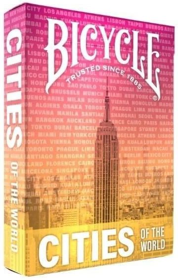 Noś świat w kieszeni z kartami Bicycle(R) Cities of the World! Każda karta przedstawia panoramę innego miasta z całego świata. 52 karty 52 destynacje! Piękne, nowoczesne karty w foliowym pudełku Twoja kolejna partia kart może być inspiracją do podróży życia! WYKOŃCZENIE FOLII: składane pudełko owinięte folią mieni się niczym zachód słońca nad Twoim ulubionym miastem. INDYWIDUALIZACJA: nowoczesny i tematycznie zaprojektowany tył karty.