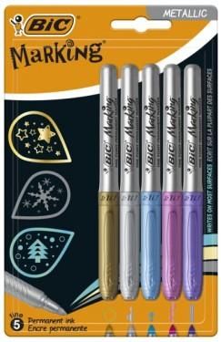 BIC Marking Metallic Ink Markery 5 kolorów Blister 5szt - Marker z tuszem permanentnym na bazie alkoholu; dostępny w 7 metalicznych kolorach, - Szybkoschnący marker, - Gumowy uchwyt zapewnia komfort trzymania, - Klip i gumowy uchwyt w kolorze tuszu, - Do stosowania na większości powierzchni: papier, zdjęcia, metal, plastik, szkło (Działa najlepiej na porowatych powierzchniach, takich jak papier, karton.) - Idealny do kreatywnych zastosowań, - Bezwonny, - Średniej szerokości końcówka 1,8mm zapewniająca szerokość linii pisania 0,8mm.