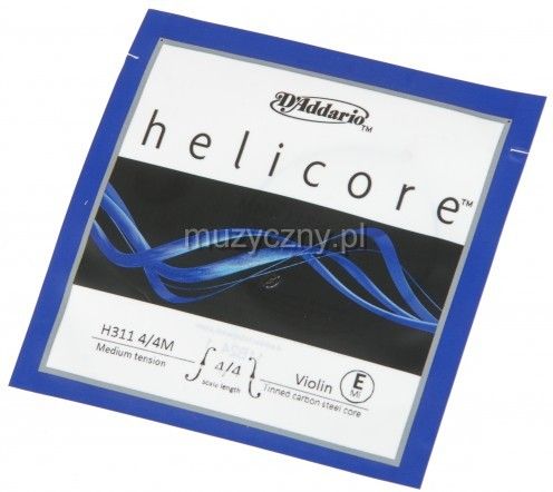 D'Addario H311 4/4 struna skrzypcowa E Struna E do skrzypiec HELICORE 4/4 naciąg średni. Stalowy rdzeń ze skręconym, wielopasmowym oplotem, jest doskonały dla zaawansowanych i profesjonalnych muzyków. Mała średnica strun pozwala na szybszą reakcję na smyczek. Struny Helicore mają ciepły, jasny dźwięk, wspaniałą stabilność stroju i długą żywotność. Wybierane są w pierwszej kolejności również przez muzyków grających na skrzypcach elektrycznych. Najpopularniejsze struny na rynku, niezależnie od preferowanego gatunku muzyki i stylu gry.