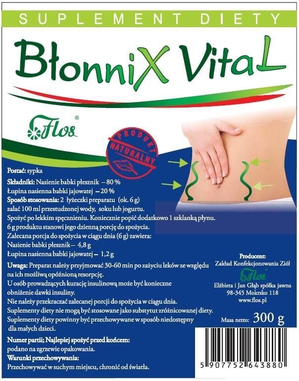 Flos Błonnix Vital 300g Zalęgające w jelitach niestrawione resztki pokarmu powodują, że praca samych jelit, ale również takich organów jak nerki, płuca czy wątroba jest utrudniona. Dlatego też należy je usuwać. Pomoże nam w tym gotowa mieszanka nasion babki płesznik (80%) i łupiny babki jajowatej (20%). Błonnik witalny działa jak miotełka- delikatnie wymiata z jelit niestrawione resztki pokarmu, przez co powoduje ich oczyszczanie Co ważne- nie ma wywołuje efektu gwałtownego przeczyszczenia. Aby uzyskać oczekiwane efekty, należy stosować błonnik witalny co najmniej 3-4 miesiące. Jakie są korzyści z przyjmowania błonnika witalnego? • polepszenie funkcjonowania organizmu • poprawa metabolizmu • poprawa perystaltyki jelit • wspomaga odchudzanie przez zmniejszanie uczucia głodu (błonnik wchłania wodę, dzięki czemu pęcznieje i wypełnia żołądek, zmniejszając uczucie głodu) • regularne spożywanie łupiny babki jajowatej łagodnie obniża po posiłkowy wzrost poziomu glukozy oraz cholesterolu i trójglicerydów we krwi • pomaga utrzymać dobrą kondycję organizmu i poprawia wygląd cery • babka jajowata jest stosowana jako lek osłaniający (np. w chorobie wrzodowej) • podnosi odporność - oczyszczanie organizmu powoduje, że nasz system immunologiczny pracuje efektywniej • dieta bogata w błonnik jest szczególnie zalecana przy otyłości i miażdżycy • stanowi naturalny detoks- wchłania niekorzystne substancje toksyczne, oczyszczając w ten sposób organizm • pomaga zapobiegać bólom towarzyszącym hemoroidom • opóźnia procesy starzenia się organizmu Składniki: nasienie babki płesznik - 80 %, łupina nasienna babki jajowatej - 20 % Sposób stosowania: 2 łyżeczki produktu (6 g) zalać 100 ml przestudzonej wody, soku lub jogurtu. Spożyć po lekkim spęcznieniu. Koniecznie popić dodatkowo 1 szklanką płynu. 6 g produktu stanowi dzienną porcję do spożycia. Zalecana porcja do spożycia w ciągu dnia (6 g) zawiera: nasienie babki płesznik - 4,8 g, łupina nasienna babki jajowatej - 1,2 g. Warunki przechowywania: przechowywać w suchym miejscu, chronić od światła. Masa netto: 300 g