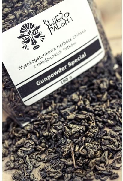 Gunpowder Special, to najlepsza z herbat rodzaju Gunpowder, wysokogatunkowa herbata chińska z młodziutkich listków herbaty pozwijanych w charakterystyczne kształty - kulki o jednolitym ciemnym kolorze i specyficznym srebrzystym połysku. Po zetknięciu herbaty z wodą słuchać charakterystyczne strzelanie. Bardzo polecana w przeciwdziałaniu chorobom związanym z układem krążenia. Dodatkowo wzmacnia orgznizm poprzez ułatwienie wydalania z niego toksyn. Sposób przygotowania: Woda o temperaturze około 80 stopni Czas zaparzania: około 1:30-2:00 minut Możliwe wielokrotne zaparzanie Ważne informacje: Kraj pochodzenia: Chiny