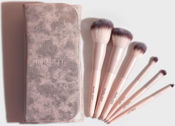 BRUSH SET IN CASE - SILVER marki INGLOT. Zestaw pędzli do makijażu twarzy oraz oczu. Umożliwi sprawne i bezproblemowe wykonanie pełnego make-up'u, bez względu na umiejętności i doświadczenie osoby nimi się posługującej. W skład zestawu wchodzi 6 sztuk pędzli, które zostały wykonane z miękkiego i elastycznego, dwukolorowego syntetycznego włosia, dzięki czemu nie podrażniają i nie drapią nawet mocno wrażliwej skóry. Dobrze wyprofilowana rączka została pokryta brzoskwiniowo-waniliowym odcieniem, który sprawia, że pędzle wyglądają bardzo kobieco. Dodatkowo do zestawu zostało dołączone etui zapinane na 2 napy oraz posiadające w środku specjalnie wydzielone kieszonki na pędzle, wraz z klapą chroniącą włosie przed odkształcaniem. Zestaw został umieszczony w eleganckim kartoniku i idealnie nada się na prezent. Zestaw pędzli.Wykonany z syntetycznego włosia.Umożliwi stworzenie wielu makijaży.Doskonały dla profesjonalistów i amatorów.W SKŁAD ZESTAWU WCHODZĄ:- 1x Etui, - 1x Ołówkowy pędzel do makijażu oczu. WYMIARY: długość rączki 14 cm, długość włosia 0,9 cm, średnica włosia 0,6 cm.- 1x Płaski języczkowy pędzel do makijażu oczu. WYMIARY: długość rączki 14 cm, długość włosia 1,2 cm, rozpiętość włosia 1,2 cm.- 1x Pędzel typu miotełka. WYMIARY: długość rączki 14 cm, długość włosia 2 cm, średnica włosia 1 cm.- 1x Pędzel do rozświetlacza. WYMIARY: długość rączki 13,6 cm, długość włosia 3,5 cm, średnica włosia 2,5 cm.- 1x Pędzel do konturowania i pudru. WYMIARY: długość rączki 14 cm, długość włosia 4 cm, średnica włosia 4 cm.- 1x Puchaty pędzel do pudru. WYMIARY: długość rączki 14,1 cm, długość włosia 5,1 cm, średnica włosia 4,3 cm.