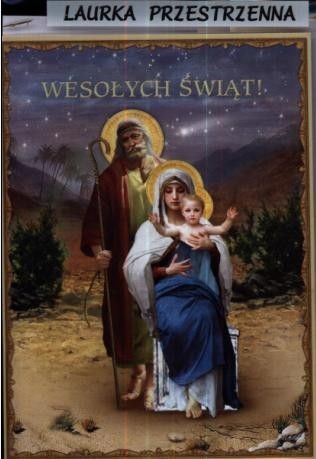 KARNET LAURKA KARTKA Boże Narodzenie A5 + KOPERTA WYMIAR: WYS. 187mm SZER. 137mm DELIKATNE ZDOBIENIA BROKATEM karnet po otwarciu jest przestrzenny typu 3D zadruk: dwustronny na kartonie 250g/m2, pakowany wraz z kopertą w torebkę foliową. TEKST na STRONIE TRZECIEJ: Niechaj te Święta Bożego …