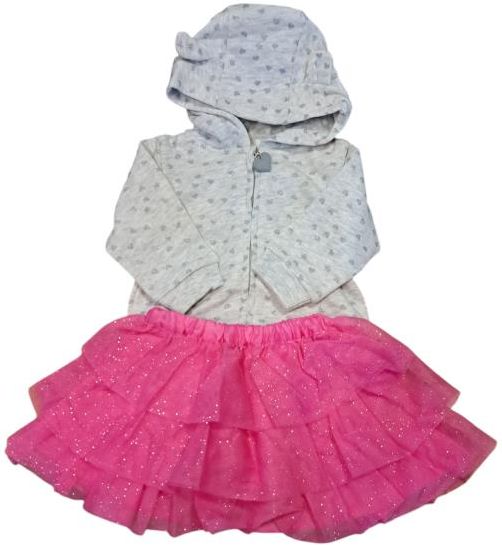 komplet dla dziewczynki T-shirt 100% bawełna kolor biały srebrny napis: "Little rainbow" napy na ramieniu tiulowa spódnica: tiulowe falbany - 100% poliester podszewka - 60% bawełna, 40% poliestre kolor różowy guma w pasie zdobiona brokatem bluza: 60% bawełna, 35% poliester, 5% metal kolor szary ze srebrną nitką zapięcie na suwak zabezpieczenie za.mka przy szyi kolekcja: Lunapark pielęgnacja: prać z podobnymi kolorami w temperaturze do 30° C. Prać i prasować po lewej stronie.
