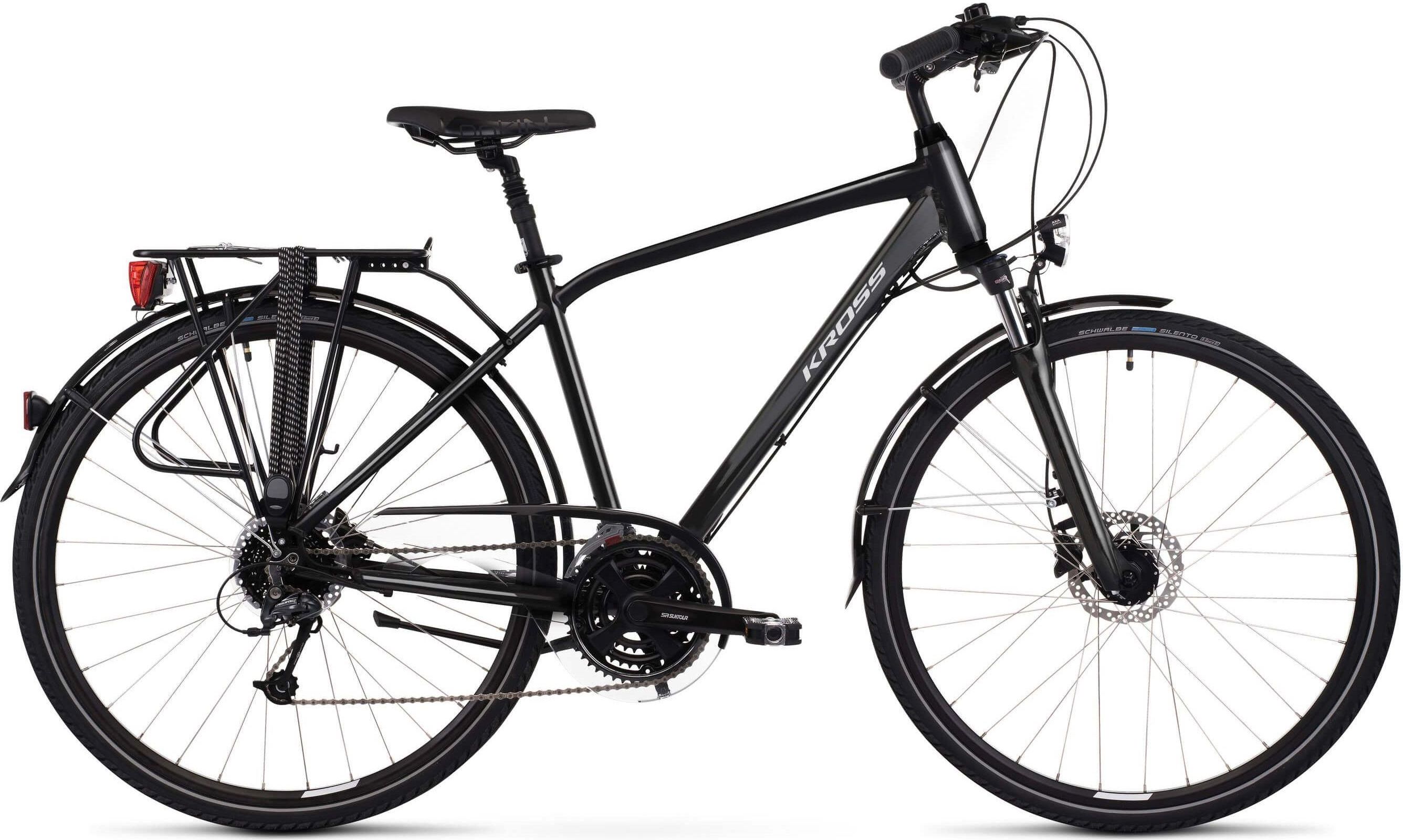 Rower trekkingowy męski Kross Trans 5.0 Kross Trans 5.0 jest modelem przeznaczonym do codziennej jazdy na średnich i długich trasach, zarówno utwardzonych asfaltowych jak i szutrowych oraz relatywnie płaskich leśnych duktach. Trekkingowy rower dla Ciebie! Kross Trans 5.0 pozwoli Ci nie tylko na komfortową jazdę z punktu A do B, ale również dłuższe wyprawy rowerowe - to wszystko dzięki bardzo wygodnej geometrii ramy, możliwości idealnego dopasowania roweru do Twoich potrzeb (regulowany wspornik kierownicy i siodła) oraz bezawaryjnemu osprzętowi. Jazda będzie wygodna... podstawą subiektywnego odczucia komfortu podczas jazdy na rowerze jest pozycja nań. Kross Trans 5.0 umożliwia jazdę z praktycznie wyprostowanymi plecami. Markowe siodło jest żelowe, a chwyty kierownicy ergonomiczne - dając tym samym rewelacyjną pewność prowadzenia roweru - nawet obciążonego sakwami. Bezawaryjność w podróży... Polski producent zadbał o bezawaryjną eksploatację roweru, stosując sprawdzony osprzęt marki Shimano (np. Alivio, Nexus), Sr Suntour, Schwalbe. Wyposażenie w cenie roweru jest wyjątkowo bogate zwiększając tym samym funkcjonalność i uniwersalne przeznaczenie roweru. W cenie roweru otrzymasz: przednią piastę z prądnicą zasilającą oświetlenie roweru, komplet błotników, podpórkę rowerową, bagażnik z gumami do przewozu rzeczy, osłonę mechanizmu korbowego i łańcucha, amortyzowany wspornik siodła i regulowany wspornik kierownicy. Dzięki zastosowanej technologii Hydro-FTube rama Kross Trans 5.0 cechuje się precyzją wykonania, a także wysoką wytrzymałością. W modelu zastosowaliśmy także linki prowadzone wewnątrz ramy. Dzięki temu ich żywotność się wydłuża, chroniąc je przed błotem, piachem i deszczem. To także łatwiejsze czyszczenie ramy po podróży w niekorzystnych warunkach atmosferycznych.