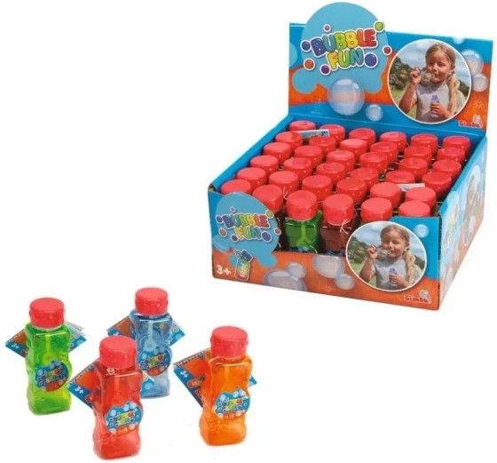 Bańki mydlane 60ml mix ean: 4006592094119 producent/wydawca: Simba wydanie: Buteleczki z nowym designem,4 kolory opakowania, 36 sztukw displayu, 60 ml / 9 cm; 3l+ sygnatura 9020523