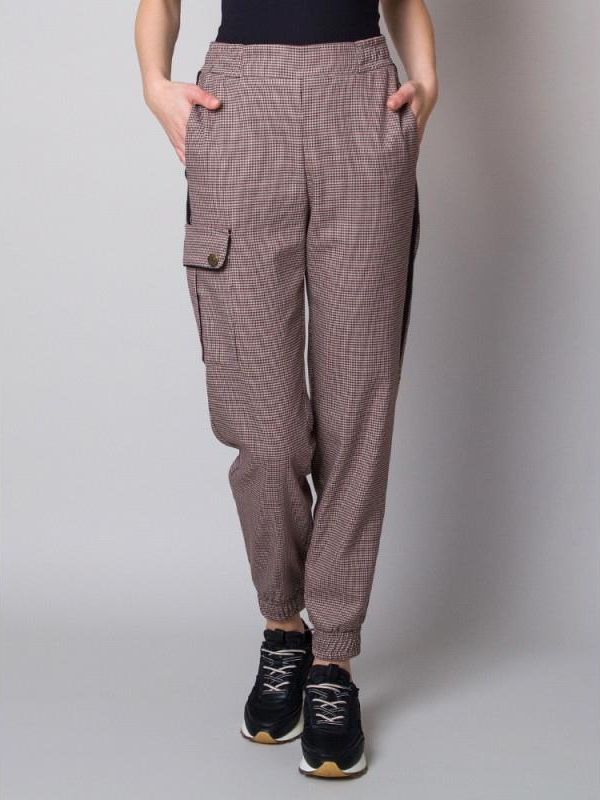Spodnie damskie typu bojówki Spodnie damskie typu bojówki, ze ściągaczami na nogawkach, czarnymi lampasami i dużą kieszenią CARGO na prawej nogawce zapinaną na ozdobne guziki w kolorze złota. Spodnie posiadają podwyższony stan oraz szeroką gumę w pasie. Dołącz do zakupów bluzę typu bomber i stwórz casualowy komplet! Skład tkaniny: 65% poliester, 32% wiskoza, 3% elastan; skład tkaniny lampasów: 89% poliester, 11% elastan Kolor główny: czarno-bordowa drobna pepitka Kieszeń typu CARGO, wysoki stan Producent: Willsoor Gwarancja: 24 m-ce