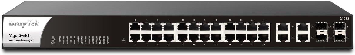 24 porty Ethernet 10/100/1000Mbps, 4 porty Gigabit SFP/RJ-45 Combo DrayTek VigorSwitch G1282 to zarządzalny switch warstwy 2, będący idealnym rozwiązaniem umożliwiającym rozszerzenie instniejącej sieci Gigabit. Oferuje 24 porty Ethernet 10/100/1000Mbps oraz 4 porty Gigabit SFP/RJ-45 Combo umożliwiające podłączenie modułu mini GBIC i wykorzystanie technologii światłowodowej. Źródło: Draytek.pl VigorSwitch G1220 umożliwia kontrolowanie dostępu do sieci na podstawie uwierzytelnienia użytkownika, dzięki zastosowanemu protokołowi 802.1x. Ponadto switch został wyposażony w funkcjonalność VLAN, oferując korzyści zarówno w sferze wydajności, jak i bezpieczeństwa. Dzięki VigorSwitch można utworzyć wiele grup VLAN, a co za tym idzie odizolować ruch pomiędzy użytkownikami, w ten sposób zapewnia się zarówno większe bezpieczeństwo, jak i ograniczenie rozsyłania zbędnego ruchu w sieci. Wsparcie VLAN umożliwia stosowanie zaawansowanych technik, jak: VLANy portowe - separacja portów switcha VLANy tagowane (802.1Q) - identyfikacja na podstawie VID tryb Metro - szybka konfiguracja VLANów portowych, która tworzy 24 lub 25 grup podwójne tagowanie (802.1Q-in-Q) - traktowanie wszystkich ramek jako nietagowane i dodawanie dodatkowego znacznika Źródło: Draytek.pl Interfejsy 24x 10/100/1000Mbps Porty Źródło: Draytek.pl 4x Porty SFP/Gigabit RJ-45 1x Port konsoli Od wersji oprogramowania 2.4.3 dostępna jest opcja ONVIF Surveillance, która służy do zarządzania systemem CCTV w sieci. Zarządzanie pasmem: Limitowanie pasma: dla danych przychodzących istnieje możliwość zdefiniowania progu dla całego ruchu oraz progu dla kontroli ruchu Broadcast/Multicast dla danych wychodzących istnieje możliwość zdefiniwania progu dla całego ruchu Mechanizmy QoS: priorytet portu priorytet VLAN tag na podstawie 3 bitów w znaczniku klasyfikacja ToS na podstawie pola ToS w nagłówku pakietu IP klasyfikacja Diffserv na podstawie 6 bitowego pola DSCP w nagłówku pakietu IP Funkcje dodatkowe: wykrywanie i blokowanie pętli wsparcie IGMP Snooping dla grup multicast GVRP (GARP VLAN Registration Protocol) dla dynamicznego utrzymywania informacji VLAN STP/RSTP umożliwiający uniknięcie pętli Port Trunking dla logicznego łączenia portów w celu osiągnięcie większych prędkości przesyłania danych Diagnostyka i zarządzanie: interfejs WUI (konfigurator WWW) 2 poziomy administrowania: Administrator i Gość Port Mirror umożliwia monitorowanie ruchu poprzez kopiowanie danych z wybranych portów do zdefiniowanego portu VSM (Virtual Stack Management) pozwala na łączenie kilku switchy w grupę w celu łatwiejszego zarządzania Alarm e-mail, SMS oraz Trap(SNMP) Tabela zawierająca 120 ostatnich wpisów log Prosty licznik danych oraz szczegółowy licznik danych dla każdego z portów switcha Narzędzia umożliwiające diagnostykę pamięci, pętli loopback oraz ping