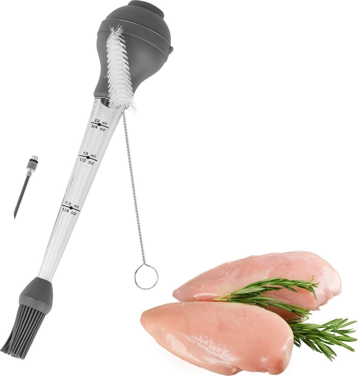 Szpryca strzykawka do peklowania marynowania Tadar Dlaczego warto kupić? Samodzielnie przygotujesz wędliny w domowej kuchni Doprawisz i wzbogacisz mięso przed pieczeniem, wędzeniem lub grillowaniem Poradzisz sobie z peklowaniem nastrzykowym Bez problemu ją umyjesz po skończonej pracy Marka: Tadar Kod produktu: 5903313424837 Skład zestawu: - pojemnik z pędzelkiem i pompką, - szczotka do czyszczenia, - igła Elementy Element 1: pojemnik z pędzelkiem i pompką, - pojemność: 22 ml, - długość: 31 cm, - średnica pędzelka: 2,5 cm, - średnica pompki: 6,5 cm Element 2: szczotka do czyszczenia: długość: 22 cm Element 3: igła, - długość całkowita: 6 cm, - średnica wewnętrzna: 2 mm Dane techniczne Liczba elementów: 3 Materiał: tworzywo sztuczne, silikon Kolor: szary Waga netto (g): 100 Rodzaj opakowania: kolorowa etykieta, folia Szpryca do peklowania i marynat Tadar przyda się każdemu, kto chce we własnym domu przygotować wędliny, pieczeń lub wędzonki. Strzykawka do peklowania z silikonową pompką ma nierdzewną igłę. W zestawie znajdziesz też szczoteczkę do dokładnego czyszczenia korpusu szprycy – pojemność 22 ml – po marynowaniu. Pędzelek silikonowy do smarowania mięsa olejem lub marynatą z zewnątrz pomoże ci przygotować wiele dań i składników np. na grilla z rodziną.