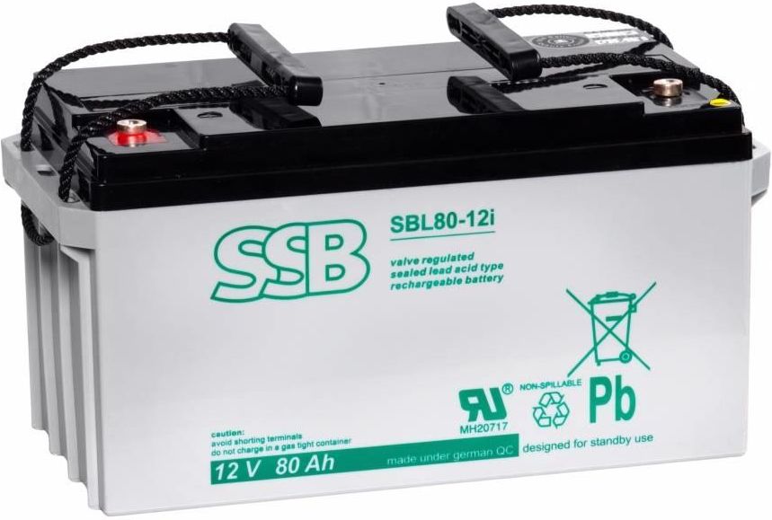 Akumulator SSB SBL 80-12i 12V 80Ah AGM Parametry techniczne: Napięcie: 12 V Pojemność: 80 Ah Typ: VRLA - AGM Waga: 24 kg Żywotność: 10 - 12 lat Wymiary: Długość: 350 mm Szerokość: 167 mm Wysokość: 182 mm Konektor: Gwint M6 Technologia: AGM – kwasowe akumulatory bezobsługowe, z elektrolitem uwięzionym w separatorze z maty szklanej. Typ: szczelne akumulatory kwasowo-ołowiowe, z zaworami bezpieczeństwa. Zastosowanie: Telekomunikacja Energetyka Przemysł Medycyna Do awaryjnego zasilania w: Centralach telefonicznych Stacjach bazowych i przekaźnikowych Siłowniach prądu stałego Zasilaczach TV kablowych Oświetleniu ewakuacyjnym Systemach alarmowych UPS-ach o mocach 1-800kVA Charakterystyka: Zwarta konstrukcja 12V – monoblok Bezobsługowe (w zakresie uzupełnienia elektrolitu) Duże bezpieczeństwo eksploatacji poprzez zastosowanie wentyli nadciśnieniowych (zaworów) Oszczędna przestrzeń instalacji Bardzo duża koncentracja energii Wentylacja zgodnie z wymogami DIN VDE 0510 Temperatura pracy -15°C do +50°C (zalecana 20°C) Możliwość pracy w dowolnym położeniu (wyłączając ładowanie)