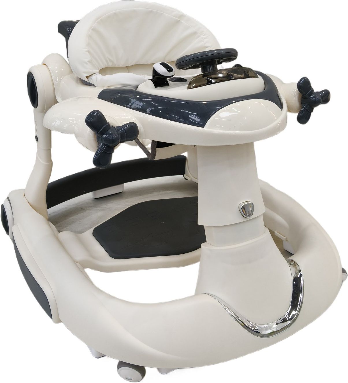 Chodzik 3w1 Samolocik BDMU Kids – Przygoda w Chmurach! Podaruj swojemu dziecku radość z odkrywania świata dzięki wielofunkcyjnemu chodzikowi w kształcie samolotu. Model od BDMU Kids to nie tylko pomoc w nauce stawiania pierwszych kroków, ale prawdziwe centrum zabawy. Wyjątkowy design w kolorze jasnego beżu sprawia, że chodzik prezentuje się niezwykle stylowo i pasuje do każdego wnętrza. Trzy funkcje w jednym urządzeniu (3w1): ​Klasyczny Chodzik: Zapewnia stabilne wsparcie podczas nauki chodzenia, pozwalając maluchowi bezpiecznie przemieszczać się po domu. ​Popychacz (Krzesło do pchania): Idealny dla dzieci, które już pewniej stoją na nogach i chcą doskonalić równowagę, prowadząc swój "samolot" przed sobą. ​Funkcja "Konia na biegunach": Dzięki specjalnie zaprojektowanej podstawie, chodzik w kilka chwil zamienisz w bezpieczny bujak – idealny do relaksu i zabawy statycznej. Interaktywny kokpit małego pilota ​Panel do zabawy został zaprojektowany tak, by rozwijać zdolności motoryczne i wyobraźnię dziecka: ​Kierownica i dźwignia jak w prawdziwym samolocie: Pozwalają dziecku poczuć się jak za sterami maszyny. ​Wiatraczki po bokach: Kręcące się elementy przyciągają uwagę i zachęcają do ćwiczenia sprawności dłoni. ​Efekty dźwiękowe i świetlne: Wesołe melodyjki oraz kolorowe światełka sprawiają, że każda minuta w chodziku jest fascynująca. ​Bezpieczeństwo i Komfort przede wszystkim: ​Belka antykolizyjna (osłona przeciwzderzeniowa): Chroni dziecko przed siłą uderzenia o przeszkody oraz zabezpiecza Twoje meble i ściany przed zarysowaniem. ​Regulacja wysokości: Pozwala na idealne dopasowanie chodzika do wzrostu dziecka, zapewniając prawidłowe ułożenie nóżek i chroniąc stawy. ​Mięciutkie siedzenie: Wykonane z materiałów przyjaznych dla skóry, zapewnia komfort nawet podczas długiej zabawy. ​Wygodny podnóżek: Chroni stopy dziecka, gdy korzysta ono z funkcji bujaka lub jest prowadzone przez rodzica. Specyfikacja techniczna: ​Marka: BDMU Kids ​Model: Samolocik 3w1 ​Kolor: Jasny beż ​Materiał: Wysokiej jakości tworzywo sztuczne (bezpieczne i trwałe) ​Funkcje dodatkowe: Muzyka, światła, obrotowe wiatraczki, ruchoma dźwignia Zadbaj o rozwój swojego dziecka w wielkim stylu! Chodzik BDMU Kids to idealny balans między nauką chodzenia a radosną zabawą.