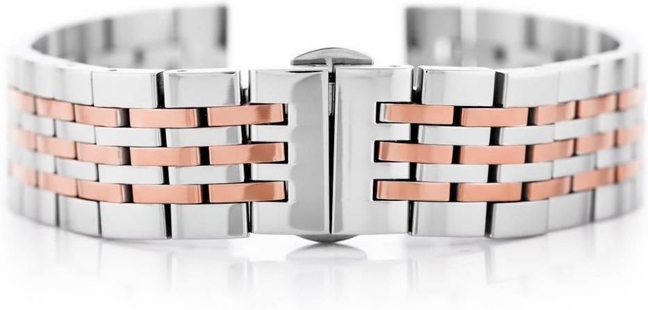 Bransoleta Pacific Model 4 srebrno róż.złota 18mm Bransoleta Pacific Model 4 srebrno róż.złota 18mm WYMIARY: szerokość przy mocowaniu: 18mm szerokość bransolety: 18/16mm długość całkowita po rozłożeniu: 185mm maksymalny obwód: ok. 17 cm (do obwodu należy doliczyć rozmiary koperty docelowego zegarka) OPIS: Stalowa bransoletka z zapięciem motylkowym do zegarka wysokiej jakości w kolorze srebrno-różowozłotym. Możliwość skrócenia bransolety poprzez usunięcie ogniw - można usunąć maksymalnie 6, szerokość jednego ogniwa to ok. 8mm. Parametry Wysokość towaru w centymetrach: 5 Długość towaru w centymetrach: 15 Szerokość towaru w centymetrach: 5 Waga gabarytowa w gramach: 62.5 Szerokość: 18mm KOLOR PASKA/KOPERTY: Różowe złoto, Srebrny BIAŁE ZDJĘCIA: Tak tayma-11622 Model 4