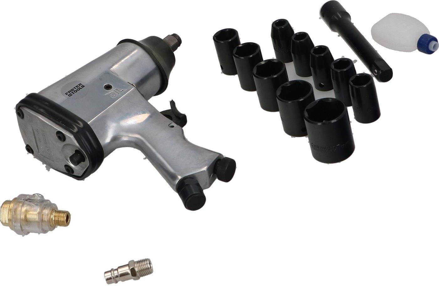 Klucz pneumatyczny przystosowany do wkręcania jak i odkrecania śrub Klucz posiada bardzo solidną budowę o ergonomicznym kształcie, która zapewni długą trwałość urządzenia i odporność na uszkodzenia Ergonomiczny uchwyt ułatwi pracę nawet w trudnych warunkach Parametry techniczne urządzenia Moment obrotowy: 310Nm Uchwyt 1/2 cala, przyłącze powietrza 1/4 cala W skład zestawu wchodzą 10 sztuk nasadek udarowych 1/2 cala (9-27mm), przedłużacz 1/2 cala o długości 125mm, klucz imbusowy 5mm, naolejacz, butelka oleju o pojemnosci 15ml oraz króciec (gwint zewnętrzny męski) Zestaw znajduje się w praktycznej plastikowej walizce