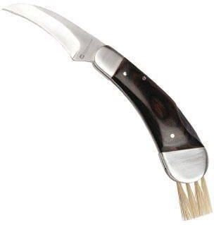 Nóż do zbierania grzybów marki Schwarzwolf, wykonany ze stali nierdzewnej i drewna, wyposażony w pędzelek do czyszczenia grzybów.