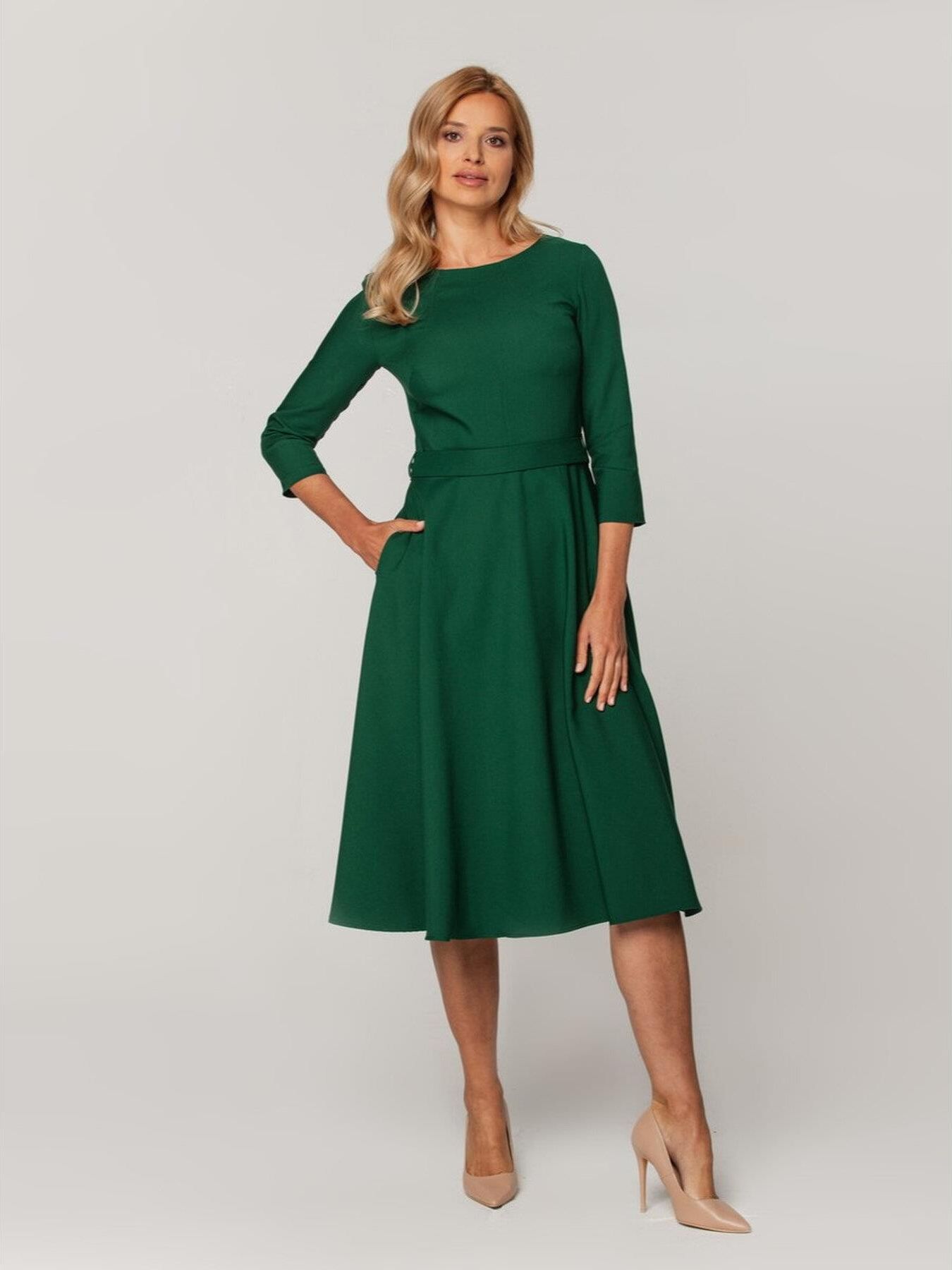 Rozkloszowana sukienka MIDI Elegancka sukienka MIDI z rozkloszowanym dołem i okrągłym dekoltem. Sukienka posiada rękaw 3/4 i jest zapinana na plecach za pomocą zamka błyskawicznego. Charakterystycznymi cechami tego modelu są dwie kieszenie oraz pasek, który można wiązać na wiele sposobów. Sukienka świetnie kamufluje niedoskonałości figury, a dzięki paskowi w talii tworzy piękną, klepsydrową sylwetkę. Kolor główny: ciemnozielona Długość rękawów: 3/4 Rodzaj sukienki: rozkloszowana, długość MIDI Skład tkaniny: 37% wiskoza, 59% poliester, 4% elastan Skład podszewki: 98% poliester, 2% elastan Wyprodukowano w Polsce Gwarancja: 24 m-ce