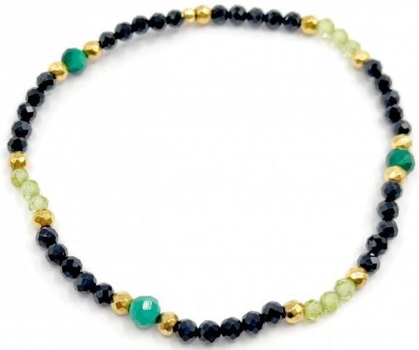 Bransoletka wykonana ze srebra próby 925, pozłacanego 24 karatowym złotem. Kamień: Spinel+ Malachit + Oliwin i Hematyt Rozmiar kamienia: 4/2mm Długość: 17,5 cm Zapięcie: gumka Bransoletka może być wykonana na zapięciu- prosimy o informację w uwagach do zamówienia Biżuteria ręcznie wykonana, produkt Polski.