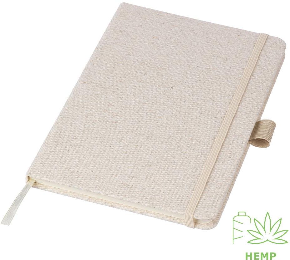 Notatnik ok. A5, posiada 80 stron w linie, tasiemka zakładkowa umożliwia wygodne zaznaczanie ostatniej strony lub ważniejszych notatek, dodatkowe zamknięcie w postaci dopasowanej kolorystycznie elastycznej opaski, posiada otwór na długopis, zmieści się do szkolnego plecaka, ikona konopi na produkcie, produkt wykonany z konopi