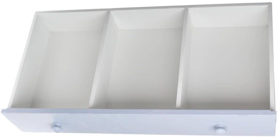 Potrójna półka w formie szuflady z błękitnym frontem. Z tyłu mocowanie ułatwiające powieszenie na ścianie. Wymiary: 63x31x11,5cm