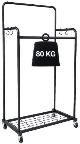 Wieszak na ubrania z półką, kółkami i haczykami – stabilny stojak na odzież Praktyczny wieszak na ubrania na kółkach idealny do domu, garderoby, sklepu czy biura. Dzięki solidnej konstrukcji z metalu zapewnia stabilność i dużą nośność. Mobilny stojak na ubrania – wyposażony w kółka z hamulcami, dzięki czemu łatwo go przestawić i unieruchomić w wybranym miejscu. Haczyki w zestawie – idealne na torebki, czapki, paski czy inne akcesoria. Półka dolna – sprawdzi się do przechowywania butów, pudeł czy koszy na drobiazgi. Duża przestrzeń na wieszaki – zmieści kurtki, płaszcze, marynarki, koszule i inne elementy garderoby. Minimalistyczny design – czarna, elegancka konstrukcja pasuje do każdego wnętrza. Idealny do przedpokoju sypialni garderoby sklepu odzieżowego biura Wymiary Wysokość 155 cm Głębokość 41 cm Szerokość 72 cm Kolor: czarny, Materiał: metal Szukasz mobilnego wieszaka na ubrania z półką i haczykami? Ten model to połączenie funkcjonalności i nowoczesnego stylu! Ten praktyczny i elegancki stojak/wieszak na ubrania idealnie sprawdza się jako wypełnienie przestrzeni w domu, bądź mieszkaniu dzięki swojemu nowoczesnemu wyglądowi. Wytrzymała konstrukcja wraz z ruchomymi kółkami sprawia, że można powiesić na nim sporo ubrań bez utraty stabilności. Stojak ten zapewnia otwartą przestrzeń do przechowywania ubrań, aby były one zawsze pod ręką. Konstrukcja dzięki dużej przestrzeni do przechowywania pozwala na bezproblemowe uporządkowanie garderoby. Wieszak wykonany jest z solidnej jakości materiałów, co sprawia że będzie prezentował się świetnie nawet po dłuższym użytkowaniu. WIELOFUNKCYJNOŚĆ - Wieszak można postawić w sypialni, salonie, korytarzu lub w garderobie. Dodaje nowoczesnego i minimalistycznego akcentu do każdego pomieszczenia. Nadaje się w szczególności do przechowywania ubrań do codziennego użytku. JAKOŚĆ - Stojak wykonany jest z wysokiej jakości materiałów. Konstrukcja jest stabilna i nie odkształca się z upływem czasu. Powierzchnia jest gładka i łatwa do czyszczenia. Powierzchnia jest wytrzymała i odporna na zarysowania oraz zapewnia dłuższą żywotność. STABILNOŚĆ - Wytrzymała konstrukcja wraz z kółkami wyposażonymi w hamulce, zapewnia stabilność i bezpieczeństwo. DUŻA POJEMNOŚĆ - Stojak na ubrania wraz z regałem na buty zapewnia wystarczająco dużo miejsca na uporządkowanie ubrań, butów, pudełek do przechowywania itp. ŁATWY MONTAŻ - Do produktu dołączona jest czytelna, obrazkowa instrukcja, dzięki której bezproblemowo zamontujesz stojak. Wszystkie potrzebne rzeczy potrzebne do montażu znajdują się w opakowaniu produktu. Zawartość zestawu Elementy składające się na stojak; Obrazkowa instrukcja obsługi; Wszystkie niezbędne narzędzia do złożenia produktu;