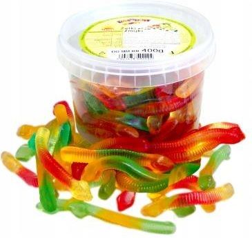 KARTON ZBIORCZY ZAWIERA - 12 SZTUKPrzepyszne żelki z sokami owocowymi i witaminą C w formie wesołych dżdżownic. Pyszny smak, piękne kolory pochodzące z naturalnych barwników, wysokiej jakości żelatyna wieprzowa i brak konserwantów z pewnością są warte wypróbowania.Pyszne owocowe żelki polskiej …