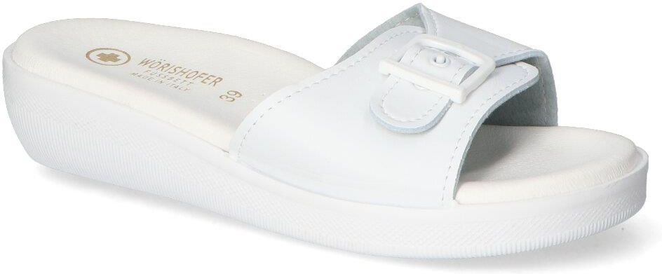 Wygodne lecznicze klapki popularnej marki Sanital Flex:- wykonane z najlepszej jakości skóry ekologicznej - wypustki na wkładce zapewniają komfort oraz odciążają stopy - posiadają 1 regulowany pasek zapewniający dopasowanie do tęgości stopy - podeszwa pod palcami o wys. 1,5 cm oraz koturn o wys. 4 cm zapewniają wygodę podczas chodzenia - klasyczny biały kolor