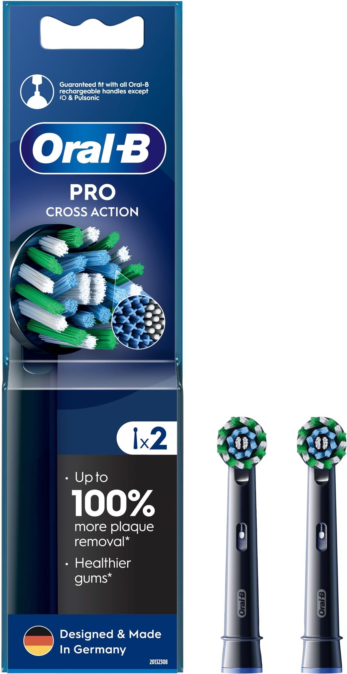 Oral-B Pro Cross Action Black 2szt. EB50BRX-2 CrossAction to jedna z najlepszych wymiennych końcówek do szczoteczek elektrycznych Oral-B, z włóknami ustawionymi pod kątem, aby usuwać nawet do 100% więcej płytki nazębnej w porównaniu ze zwykłą szczoteczką manualną. Kształt końcówki Oral-B CrossAction ze specjalnie zaprojektowanymi włóknami pozwala dokładnie otoczyć każdy ząb, a ich zaokrąglone końcówki chronią dziąsła. Te wyjątkowe włókna docierają głęboko do przestrzeni międzyzębowych, aby usuwać płytkę nazębną i pozostawiają całą jamę ustną czystszą niż w przypadku użycia zwykłej szczoteczki manualnej. Końcówka pasuje do wszystkich szczoteczek oscylacyjno-rotacyjnych. Firma Oral-B, założona w Kalifornii w roku 1950, od wielu lat dostarcza konsumentom, dentystom i sprzedawcom detalicznym na całym świecie znakomite produkty do pielęgnacji jamy ustnej. Natomiast po drugiej stronie Oceanu Atlantyckiego niemiecka firma Braun GmbH, która później połączyła siły z Oral-B, aby stworzyć akumulatorowe szczoteczki elektryczne do zębów, już ponad 80 lat temu zaczęła doskonalić swoje umiejętności, produkując najnowocześniejszy drobny sprzęt elektryczny Precyzyjne czyszczenie dzięki włóknom ustawionym pod kątem CrossAction to jedna z najbardziej zaawansowanych końcówek wymiennych do szczoteczek elektrycznych Oral-B, wyposażona w włókna ustawione pod kątem, które usuwają nawet do 100% więcej płytki nazębnej niż zwykła szczoteczka manualna. Model końcówki Oral-B CrossAction oparto na specjalnie zaprojektowanych włóknach ułożonych w taki sposób, by obejmowały jak największą powierzchnię zębów. Włókna sięgają głęboko między zęby, skutecznie usuwając płytkę nazębną i zapewniając uczucie świeżości oraz dokładniejsze mycie całej jamy ustnej niż w przypadku użycia zwykłej szczoteczki manualnej. Końcówka pasuje do wszystkich szczoteczek oscylacyjno-rotacyjnych Dokładnie czyści przestrzenie międzyzębowe Końcówka szczoteczki o kształcie inspirowanym profesjonalnym sprzętem dentystycznym dokładnie otacza każdy ząb i zapewnia precyzyjne czyszczenie, aby usunąć więcej płytki nazębnej niż w przypadku użycia zwykłej szczoteczki manualnej Regularnie wymieniaj końcówkę Dentyści zalecają wymianę końcówki szczoteczki co 3-4 miesiące. Wymienne końcówki szczoteczek Oral-B wyposażono w specjalne włókna sygnalizujące, kiedy należy wymienić końcówkę, aby zachować najwyższą skuteczność czyszczenia, w porównaniu ze szczoteczką manualną Wypróbuj 6 idealnych rozwiązań z tylko 1 szczoteczką Aby spełnić Twoje indywidualne potrzeby w zakresie pielęgnacji jamy ustnej, Oral-B oferuje szeroki wybór końcówek wymiennych do szczoteczek elektrycznych. Końcówki Oral-B pasują do wszystkich szczoteczek Oral-B, z wyjątkiem Pulsonic   Najczęściej zadawane pytania: Jak często należy wymieniać końcówkę szczoteczki? Dentyści zalecają wymianę końcówki szczoteczki co 3-4 miesiące lub częściej, kiedy włókna zużyją się lub stracą swój pierwotny kształt. Zużyte włókna tracą swoje właściwości, przez co zmniejsza się skuteczność czyszczenia Jaka jest różnica między modelem CrossAction i innymi końcówkami szczoteczek elektrycznych Oral-B? Każda końcówka szczoteczki Oral-B ma nieco inne właściwości i służy nieco innemu rodzajowi czyszczenia. Model CrossAction wyposażono w włókna ustawione pod kątem, które wyjątkowo skutecznie odrywają i usuwają płytkę nazębną oraz zapewniają znacznie lepsze efekty czyszczenia niż zwykła szczoteczka manualna. Końcówka Precision Clean pozwala uzyskać najwyższą precyzję czyszczenia i zwiększoną skuteczność w usuwaniu płytki nazębnej z linii dziąseł. Ten model działa też skuteczniej niż szczoteczka manualna. Włókna TriZone sięgają głęboko między zęby, skutecznie usuwają płytkę nazębną i umożliwiają mycie zębów w taki sposób, jak przy użyciu tradycyjnej szczoteczki manualnej. Końcówka Floss Action wyposażona jest w włókna MicroPulse, które sięgają głęboko między zęby, usuwając płytkę nazębną i zapewniając podobne efekty jak w przypadku stosowania nici dentystycznej (ale jej nie zastępują). Model 3D White wyposażono w nasadkę polerującą, która pomaga usuwać przebarwienia powierzchniowe. Końcówka Sensitive zapewnia delikatne, a jednocześnie bardzo skuteczne czyszczenie Do których szczoteczek pasuje końcówka CrossAction? Wymienna końcówka szczoteczki CrossAction pasuje do następujących szczoteczek: Oral-B Triumph, Oral-B SmartSeries, Oral-B PRO, Oral-B Vitality (z wyjątkiem Vitality Sonic) oraz Oral-B Pro-Health Power