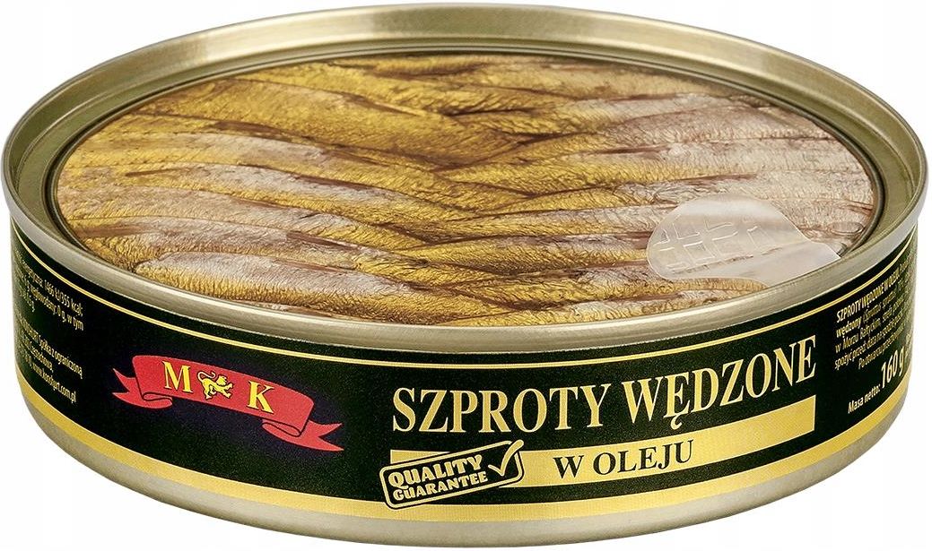3 x SZPROTY WĘDZONE W OLEJU MK 160g W zestawie 3 opakowania produktu. Produkt rybny sterylizowany. Składniki: ryba - szprot wędzony (Sprattus sprattus) 70% (dziko złowiony za pomocą włoku pelagicznego w Morzu Bałtyckim, strefa połowu: FAO 27IIId) olej rzepakowy 29% sól Masa netto: 3 x 160 g Masa netto ryb po odsączeniu: 112 g Termin przydatności: 05.2023 r. Przechowywać w temperaturze od 0 do 25 stopni C. Po otwarciu przechowywać w lodówce i spożyć w ciągu 24 godzin. Wartości odżywcze w 100 g produktu: Wartość energetyczna: 1466 kJ / 355 kcal Tłuszcz: 33 g w tym kwasy tłuszczowe nasycone: 6 g Węglowodany: 0 g - w tym cukry: 0 g Białko: 15 g Sól: 0,5 g