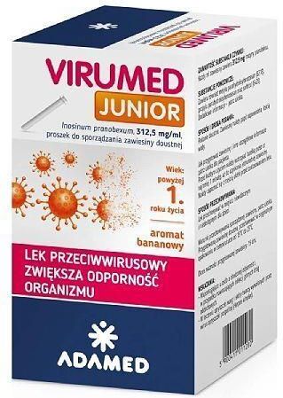 Virumed Junior jest lekiem przeciwwirusowym i zwiększającym odporność organizmu (pobudza czynność układu odpornościowego) Skład: 1 ml zawiesiny zawiera: substancję czynną: inozyny pranobeks (kompleks zawierający inozynę oraz 4-acetamidobenzoesan 2-hydroksypropylodimetyloamoniowy w stosunku molarnym 1:3) 312,5 mg. Substancje pomocnicze: maltodekstryna, sorbitol (E420), aromat bananowy [preparaty poprawiające smak i zapach, maltodekstryna, guma arabska (E414)], sukraloza, powidon K-30, potasu cytrynian, krzemionka koloidalna bezwodna, metylu parahydroksybenzoesan (E218), propylu parahydroksybenzoesan. Wskazania i działanie: Lek Virumed Junior przeznaczony jest do stosowania: Wspomagająco u osób o obniżonej odporności, w przypadku nawracających infekcji górnych dróg oddechowych. W leczeniu opryszczki warg i skóry twarzy wywołanych przez wirus opryszczki pospolitej (Herpes simplex). Lek Virumed Junior może być stosowany jedynie u pacjentów, u których w przeszłości rozpoznano zakażenie wirusem opryszczki pospolitej. Jeśli po upływie 5 do 14 dni nie nastąpiła poprawa lub pacjent czuje się gorzej, należy zwrócić się do lekarza. Dawkowanie: Dawka ustalana jest na podstawie masy ciała pacjenta oraz zależy od stopnia nasilenia choroby. Dawkę dobową należy podzielić na równe dawki pojedyncze podawane kilka razy na dobę. Dzieci w wieku powyżej 1 roku: Zalecana dawka wynosi 50 mg na kg masy ciała na dobę, zwykle 0,16 ml na 1 kg masy ciała na dobę, w 3 lub 4 równych podzielonych dawkach podawanych w ciągu doby: dzieci o masie ciała 10-14 kg: stosować 0,8 ml leku 3 razy na dobę, dzieci o masie ciała 15-20 kg: stosować 0,8-1,2 ml leku 3 razy na dobę, dzieci o masie ciała 21-30 kg: stosować 1,2-1,6 ml leku 3 razy na dobę, dzieci o masie ciała 31-40 kg: stosować 1,6-2,4 ml leku 3 razy na dobę, dzieci o masie ciała 41-50 kg: stosować 2,4-2,8 ml leku 3 razy na dobę. Dorośli, w tym pacjenci w podeszłym wieku: zalecana dawka dobowa wynosi 50 mg na kg masy ciała na dobę (0,16 ml na 1 kg masy ciała na dobę) zwykle stosuje się 9,6 ml zawiesiny (3 g) na dobę, podawane w 3 lub 4 dawkach podzielonych dawka maksymalna wynosi 12,8 ml zawiesiny (4 g) na dobę. Sposób podawania Lek podaje się doustnie. Zawiesinę należy popić odpowiednią ilością wody. Przygotowana zawiesina ma barwę białą do białawej, o smaku i zapachu bananowym. W celu odmierzenia zalecanej objętości, należy stosować strzykawkę, dołączoną do opakowania. Zawiesinę należy popić odpowiednią ilością wody. Czas trwania leczenia Czas trwania leczenia wynosi zwykle od 5 do 14 dni. Po ustąpieniu objawów podawanie leku należy kontynuować jeszcze przez 1 do 2 dni. Instrukcja przygotowania zawiesiny Lek ma postać proszku. Przed użyciem należy wymieszać go z wodą. W celu przygotowania 30 ml zawiesiny, do butelki należy dodać 15 ml przegotowanej, a następnie ostudzonej do temperatury pokojowej wody. Zamknąć butelkę i energicznie wstrząsnąć, aby rozluźnić proszek, następnie należy otworzyć butelkę. Dodać 10 ml wody (2 objętości strzykawki) za pomocą strzykawki dołączonej do opakowania. Zamknąć butelkę. Odwrócić butelkę do góry dnem i energicznie wstrząsnąć (nie krócej niż 1 minutę), aż utworzy się jednorodna zawiesina. Otworzyć butelkę. Dodać 5 ml wody (1 objętość strzykawki) za pomocą strzykawki dołączonej do opakowania. Zamknąć butelkę. Odwrócić butelkę do góry dnem i energicznie wstrząsnąć (nie krócej niż 1 minutę), aż utworzy się jednorodna zawiesina. Otworzyć butelkę. Włożyć do szyjki butelki adapter dołączony do opakowania. Przeciwwskazania: Leku Virumed Junior nie należy stosować: W przypadku uczulenia na inozyny pranobeks lub którykolwiek z pozostałych składników tego leku (objawami alergicznymi mogą być: wysypka, świąd, trudności w oddychaniu, obrzęk twarzy, warg, gardła lub języka). Jeśli u pacjenta występuje aktualnie napad dny moczanowej (silny ból stawu z obrzękiem i zaczerwienieniem skóry lub też w obrębie dużych stawów dochodzi do wystąpienia wysięku) lub badania wykazały zwiększone stężenie kwasu moczowego we krwi. Interakcje: Należy powiedzieć lekarzowi lub farmaceucie o wszystkich lekach przyjmowanych przez pacjenta obecnie lub ostatnio, a także o lekach, które pacjent planuje przyjmować. Należy zwłaszcza poinformować lekarza lub farmaceutę o lekach wymienionych poniżej, gdyż mogą one wchodzić w interakcje z lekiem Virumed Junior: Leki stosowane w leczeniu dny moczanowej (allopurynol lub inne leki). Leki zwiększające wydalanie kwasu moczowego, w tym leki moczopędne (zwiększające wytwarzanie moczu), np. furosemid, torasemid, kwas etakrynowy, hydrochlorotiazyd, chlortalidon, indapamid. Leki hamujące czynność układu odpornościowego (leki immunosupresyjne, stosowane u pacjentów po przeszczepieniu narządów lub w atopowym zapaleniu skóry), zydowudyna (lek stosowany w leczeniu pacjentów zakażonych wirusem HIV). Działania niepożądane: Jak każdy lek, lek ten może powodować działania niepożądane, chociaż nie u każdego one wystąpią. Każdy lek może wywołać reakcję alergiczną, jednakże ciężkie reakcje alergiczne po przyjęciu leku Virumed Junior występują rzadko. Należy przerwać stosowanie leku i natychmiast skonsultować się z lekarzem, jeżeli wystąpi którykolwiek z poniższych objawów: nagle pojawiający się świszczący oddech trudności z oddychaniem, obrzęk powiek, twarzy lub warg, wysypka lub świąd (zwłaszcza jeżeli dotyczą całego ciała). Inne możliwe działania niepożądane leku Virumed Junior wymieniono poniżej. Bardzo często, występujące u więcej niż 1 osoby na 10: zwiększone stężenie kwasu moczowego we krwi, zwiększone stężenie kwasu moczowego w moczu. Często, występujące u nie więcej niż 1 osoby na 10: zwiększenie aktywności enzymów wątrobowych lub stęż