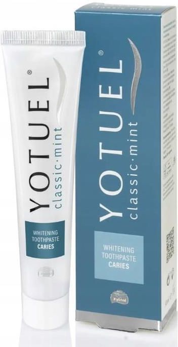 1x Pasta YOTUEL Wybielająca classic mint skuteczna i delikatna YOTUEL Classic Mint Stworzona z myślą o codziennej ochronie, specjalistyczna pasta wybielająca, która oferuje nie tylko skuteczne usuwanie przebarwień, ale także kompleksową ochronę zębów i dziąseł. Dzięki delikatnej formule, pasta jest idealna dla osób o wrażliwych zębach i problemach przyzębia. Kluczowe właściwości Niski współczynnik ścieralności (RDA = 40): Pasta jest wyjątkowo łagodna dla szkliwa, co czyni ją bezpieczną do codziennego użytku. Wybielanie bez uszkadzania szkliwa: Dzięki zaawansowanej formule, pasta skutecznie usuwa plamy i przebarwienia, jednocześnie dbając o zdrowie zębów. Skład bogaty w fluor (1450 ppm): Wspomaga remineralizację szkliwa, zapobiega próchnicy i wzmacnia zęby. Naturalne składniki: Zawiera ksylitol i stewię, które wspierają zdrowie jamy ustnej i działają przeciwpróchniczo. Korzyści Bezpieczne wybielanie: Pasta stopniowo rozjaśnia zęby, bez ryzyka podrażnień i uszkodzenia szkliwa. Ochrona przed próchnicą: Składniki aktywne, takie jak fluor i ksylitol, wspomagają walkę z próchnicą oraz zapobiegają jej powstawaniu. Zachowanie świeżości: Miętowy smak pasty pozostawia długotrwałe uczucie świeżości w jamie ustnej. Wsparcie w walce z kamieniem nazębnym: Regularne stosowanie pasty zapobiega osadzaniu się kamienia nazębnego. Specjalne właściwości Brak detergentów: YOTUEL Classic Mint nie zawiera SLS (Sodium Lauryl Sulfate), co sprawia, że pasta jest delikatna i nie podrażnia dziąseł. Działanie antybakteryjne: Pomaga w zwalczaniu bakterii odpowiedzialnych za nieświeży oddech i problemy z dziąsłami. Zalecenia Pasta jest rekomendowana dla osób z wrażliwymi zębami, które poszukują delikatnej, ale skutecznej ochrony. Idealna do codziennego stosowania, aby utrzymać zęby w doskonałym stanie. Działanie YOTUEL Classic Mint działa wszechstronnie – wybiela zęby, remineralizuje szkliwo, chroni przed próchnicą i zapobiega osadzaniu się kamienia nazębnego. Efekty Bielszym uśmiech już po kilku tygodniach stosowania. Zdrowe i wzmocnione szkliwo. Długotrwała ochrona przed próchnicą i kamieniem nazębnym. Świeży oddech na długo po każdym użyciu. Sposób użycia Używaj pasty dwa razy dziennie, szczotkując zęby przez minimum 2 minuty. Pasta nadaje się do stosowania wraz ze szczoteczką manualną oraz elektryczną.