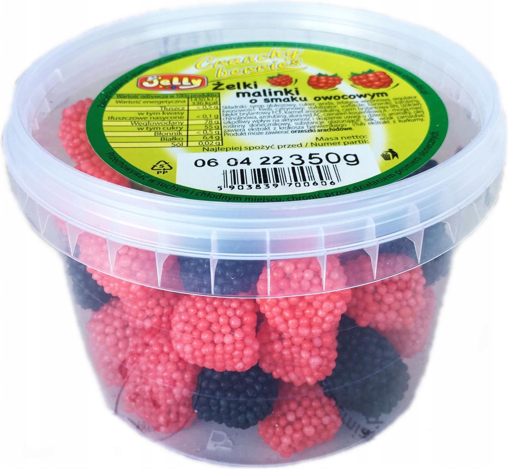 KARTON ZBIORCZY ZAWIERA - 12 SZTUKTradycyjne polskie żelki produkowane z naturalnego soku owocowego. Dla poprawienia odporności żelki mają dodatkowo witaminę C.SKŁADNIKI: cukier, syrop glukozowy, woda, żelatyna wieprzowa, regulator kwasowości: kwas cytrynowy; sok malinowy 0,5% w proszku, stabilizator: sorbitole; barwniki: karmin, karoteny; błękit brylantowy FCF, karmel amoniakalny, czerń brylantowa BN, kompleksy miedziowe chlorofili i chlorofilin; aromaty, substancje glazurujące: talk, wosk pszczeli biały, wosk carnauba; zawiera ekstrakt z krokosza barwierskiego i/lub ekstrakt z kurkumy. Produkt może zawierać orzechy arachidowe.Wartość odżywcza w 100g: Wartość energetyczna: 1430 kJ (336 kcal), Tłuszcz:<0,5g, W tym kwasy tłuszczowe nasycone: <0,1g, Węglowodany: 78g, W tym cukry: 55g, Białko: 6,4g, Sól: 0,02g.Przechowywać w suchym i chłodnym miejscu.