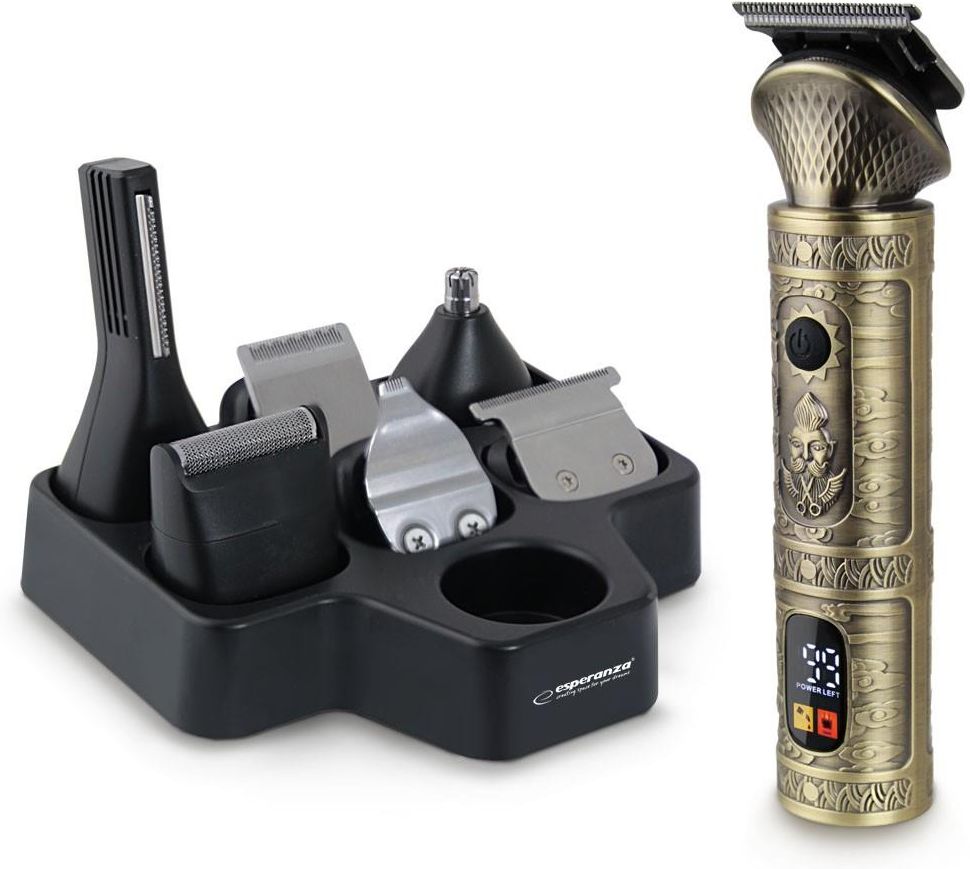 MASZYNKA DO STRZYŻENIA WŁOSÓW BRODY BEZPRZEWODOWA GOLARKA TRYMER ZESTAW 7W1 Bezprzewodowa maszynka do strzyżenia włosów z funkcją trymera 7w1 Esperanza ADONIS to idealne rozwiązanie dla osób ceniących wygodę i wszechstronność. Stwórz salon fryzjerski w swoim domu! Maszynka do strzyżenia i trymer 7w1 Esperanza ADONIS Wszechstronność i wygoda w jednym urządzeniu Bezprzewodowa maszynka do strzyżenia włosów z funkcją trymera Esperanza ADONIS 7w1 to niezastąpione narzędzie do pielęgnacji męskiego wyglądu. Dzięki wymiennym głowicom i szerokiemu zestawowi nasadek z łatwością zadbasz o fryzurę, zarost, wąsy czy włosy w trudno dostępnych miejscach. Nowoczesny design i pełna kontrola Eleganckie, zdobione wykończenie maszynki połączono z praktycznym wyświetlaczem LCD, który na bieżąco informuje o stanie naładowania akumulatora, procesie ładowania oraz konieczności oliwienia ostrzy. Najważniejsze cechy i funkcje 7 wymiennych głowic do różnych zastosowań (strzyżenie włosów, trymowanie brody, precyzyjne kontury, usuwanie owłosienia z nosa i uszu, trymer do ciała). 8 nasadek grzebieniowych – 4 typu T (1, 3, 5, 7 mm) i 4 tradycyjne (3, 6, 9, 12 mm) dla pełnej kontroli nad długością cięcia. Regulowana nasadka do trymera ciała z 4-stopniową regulacją długości. Szerokość cięcia 40 mm – idealna do szybkiego i precyzyjnego strzyżenia. Wyświetlacz LCD z informacją o poziomie baterii, ładowaniu i konieczności konserwacji. Ergonomiczna podstawka do przechowywania maszynki i akcesoriów. Wbudowany akumulator 1200 mAh – do 90 minut pracy po 2 godzinach ładowania. Nowoczesne zasilanie USB-C – w zestawie przewód USB-A/USB-C (80 cm). Zawartość zestawu Maszynka Esperanza ADONIS 7 wymiennych głowic 8 nasadek grzebieniowych Nasadka do trymera ciała z regulacją Szczoteczka do czyszczenia Kabel USB-A/USB-C (80 cm) Podstawka do przechowywania Rodzaje głowic w trymerze Trymer do ciała – bezpieczne przycinanie włosów na delikatnych partiach ciała. Precyzyjny trymer do detali – doskonały do konturowania i tworzenia wzorów, jak hair tattoo. Golarka foliowa – pozwala na uzyskanie efektu gładkiej skóry, idealna do golenia na zero. Szeroki trymer – do szybkiego strzyżenia większych partii włosów. Trymer do nosa i uszu – skuteczne i bezpieczne usuwanie niechcianych włosków. Trymer do zarostu – umożliwia równomierne przycinanie zarostu na wybraną długość. Trymer do brody i włosów – idealny do modelowania zarostu i linii włosów.