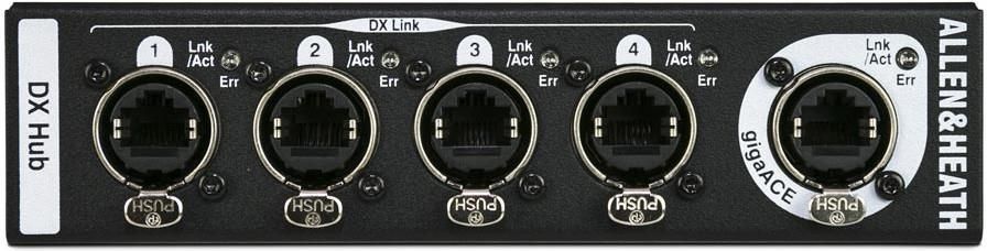 Allen & Heath DX Hub | Interfejs sieciowy dla mikserów serii dLive i SQ Allen & Heath DX Hub to sieciowy interfejs audio (hub), który jest kompatybilny z każdym mikserem serii dLive oraz SQ (jeśli wyposażone są w kartę I/O gigaACE). Znajdziemy tutaj 4 porty DX link, do których możemy podłączyć expandery (1 DX32 na port lub x2 DX168/DX164-W na port). Jeden kanał ma przesył 32x32 w próbkowaniu 96 kHz, zatem maksymalnie mamy możliwość przesyłu do 128 wejść i 64 wyjść. DX Hub to interfejs sieciowy audio (hub), który można podłączyć do każdego miksera z serii dLive lub SQ wyposażonego w slot I/O gigaACE. DX Hub jest wyposażony w 4 porty DX Link, pozwalające na podłączenie do jednostek rozszerzających dLive DX, a każdy port pozwala na przesył 32x32 kanałów w 96 kHz. Do każdego portu DX Link można podłączyć 1 ekspander DX32 lub 2 x DX168/DX164-W, umożliwiając dodanie nawet 128 wejść i 64 wyjść do systemu dLive przy użyciu jednego modułu DX Hub. By uzyskać redundantny system należy użyć 2 modułów DX Hub. 4 porty DX do połączeń z ekspanderami DX Złącza etherCON Kompatybilność z ekspanderami DX32, DX168 i DX164 32x32 kanałów audio (96 kHz) na każdy port DX Link Połączenie Cat5e (<100m) do modułu I/O gigaACE Wolnostojący lub w wersji do montażu w racku 19” Opcjonalny zestaw do montażu w racku