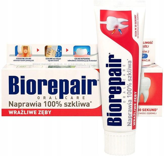 BioRepair Plus Sensitivity Double Action ochronna pasta do zębów wrażliwych wzmacniająca szkliwo bez fluoru Odpowiednia do stosowania ze szczoteczkami manualnymi, sonicznymi i elektrycznymi.⭐ Przeznaczenie: wrażliwe zęby, uszkodzone szkliwo, wzmocnienie szkliwa. Smak: miętowy Pojemność: 75ml Nie zawiera: fluoru, laurylosiarczanu sodu (SLS), parabenów, glutenu, laktozy, dwutlenku tytanu, substancji o wysokiej ścieralności (RDA~14) ani innych szkodliwych składników. Dla kogo: dla dorosłych i dzieci Plus Advanced o podwójnej czułości działania. Zmniejsza wrażliwość zębów i chroni dziąsła- 6 razy skuteczniej w przypadku nadwrażliwości. Pasta Plus Sensitivity Double Action do zębów jest przeznaczona dla osób, które chcą szybko złagodzić ból spowodowany nadwrażliwością zębów . Pomaga również w przypadku nieświeżego oddechu i zwalcza bakterie jamy ustnej Już po 30 sekundach od aplikacji tworzy ochronną warstwę na powierzchni zębów, a jednocześnie przenika głębiej, uszczelniając kanaliki zębinowe, co szybko redukuje nadwrażliwość. Wysokie stężenie microRepair® - 240 mg/g Natychmiastowa ulga w nadwrażliwości Obrona szyjek dziąsłowych Ulepszona formuła z kompleksem antybakteryjnym i przeciwpłytkowym Zapewnia skuteczną ochronę przed próchnicą i stanami zapalnymi, a także utrzymuje świeży oddech. Właściwości Biorepair Plus Sensitivity Double Action Redukuje nadwrażliwość zębiny - już od pierwszego zastosowania pasta działa skutecznie, zmniejszając nadwrażliwość zębów. Możesz cieszyć się jedzeniem i picie bez nieprzyjemnych doznań związanych z nadwrażliwością. Zapobiega przyczynom nadwrażliwości zębiny - Formuła pasty do zębów Biorepair pomaga zapobiegać przyczynom nadwrażliwości zębiny. Chroni zęby przed działaniem czynników, takich jak gorące, zimne, słodkie czy kwaśne napoje i pokarmy, które mogą wywoływać dyskomfort. Skuteczna i bezpieczna formuła - Pasta do zębów Biorepair jest opracowana z myślą o skuteczności i bezpieczeństwie. Możesz być pewien, że stosujesz produkt, który nie tylko działa, ale także jest odpowiedni dla Twoich zębów i dziąseł. Kluczowe składniki aktywne Cząsteczki microRepair: Odbudowują osłabione szkliwo zębów, tworząc długotrwałą barierę ochronną, która chroni zęby przed bodźcami termicznymi. Cząsteczki hydroksyapatytu połączone z cynkiem łączą się ze strukturą szkliwa i zębiny, docierając do najmniejszych szczelin, naprawiając powierzchnię zębów. Czym wyróżnia się pasta Biorepair Plus Sensitivity Double Action na tle innych past do zębów Biorepair® Plus Advanced Sensitivity Double Action to zaawansowana formuła Biorepair® Plus, która pomaga zwalczać nadwrażliwość i chronić dziąsła. Dzięki wysokiemu stężeniu microRepair® wynoszącemu 240 mg/g zapewnia natychmiastową ulgę w bólu spowodowanym nadwrażliwością i długotrwałą ochronę. Formuła wzbogacona o ksylitol, CPC i mastyks Chios zapewnia ochronę i zdrowie dziąseł. Uszkodzone szkliwo i cofające się dziąsła to dwie przyczyny nadwrażliwości zębów. Kwaśne pokarmy i zużycie mechaniczne (np. szczotkowanie) powodują stopniowe niszczenie szkliwa. Płytka bakteryjna gromadząca się na linii dziąseł może powodować stan zapalny i recesję błony śluzowej, odsłaniając wrażliwe kanaliki zębinowe znajdujące się w zębinie, które prowadzą do nerwów zębów. Gorące, zimne lub słodkie substancje nie znajdując żadnej bariery, wchodzą w kontakt z nerwami, powodując dokuczliwe kłucia, które stają się coraz bardziej bolesne. Czym jest microRepair microRepair® to cząsteczki zbudowane z hydroksyapatytu, których skład jest bardzo podobny do składu szkliwa zębów. Dzięki temu podobieństwu microRepair® ma właściwości biomimetyczne, dzięki którym mikrocząsteczki integrują się ze szkliwem i zębiną, co powoduje aktywność naprawczą. microRepair® otacza zęby i tworzy długotrwałą barierę ochronną, która zapobiega przedostawaniu się bodźców termicznych do nerwu zęba. Sposób użycia Nałóż niewielką ilość pasty do zębów (około wielkości ziarnka grochu) na szczoteczkę. Szczotkuj zęby przez dwie minuty, a następnie dokładnie wypłucz usta wodą lub użyj płynu do płukania jamy ustnej oraz akcesoriów międzyzębowych. Biorepair może być stosowany bez nadzoru osoby dorosłej, nawet przez dzieci poniżej 6 roku życia, ponieważ nie zawiera fluoru. microRepair wspomaga remineralizację szkliwa i zębiny. Skład Woda, hydroksyapatyt cynku*, gliceryna, sorbitol, PEG-32, guma celulozowa, krzemionka, mirystoilosarkozynian sodu, metylokokoilotaurynian sodu, kwas cytrynowy, ksylitol, aromat, chlorek cetylopirydyniowy, olejek z gumy pistacjowej (mastyksowej), sacharynian sodu, alkohol benzylowy, fenoksyetanol, benzoesan sodu, maltodekstryna, limonen.*microRepair Składniki produktu podano w momencie publikacji. Przed użyciem produktu sprawdź aktualne składniki na opakowaniu. Pasta do zębów nie zawiera fluoru, SLS, parabenów ani dwutlenku tytanu. opatrunki mocujące opaski elastyczne środki do dezynfekcji rany opatrunki do domowej apteczki Klauzula informacyjna Posiada oznakowanie CE. Posiada deklarację zgodności UE. Zawiera instrukcję/etykietę w języku polskim. Niniejsze informacje zawarte w ofercie zdjęcia, opisy itp. produktów nie zastępują konsultacji z lekarzem i nie mogą być podstawą do stosowania jakichkolwiek wyrobów medycznych, środków farmaceutycznych czy form terapii. Wszelkie decyzje w w/w kwestii należy konsultować z lekarzem. Działania niepożądane W przypadku wystąpienia działań niepożądanych należy skonsultować się lekarzem. Przechowywanie Przechowywać w miejscu niedostępnym i niewidocznym dla dzieci. Przechowywać w temperaturze pokojowej. Chronić od światła. Przeciwwskazania Tylko do użytku zewnętrznego. Stosować zgodnie z przez
