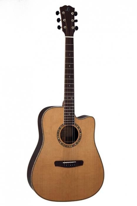Dowina Cabernet DCE L.R. Baggs SPE – gitara elektroakustyczna Specyfikacja: Gitara elektroakustyczna Seria: Vintage Kształt: dreadnought cutaway Płyta wierzchnia: lity cedr Boki i tył: lity palisander indyjski Gryf: mahoń afrykański ze wzmocnieniem z drewna wenge Podstrunnica: heban Mostek: heban Siodełko: kość, 45 mm Elektronika: L.R. Baggs SPE Stage Pro Element (wbudowany tuner, 3-pasmowy equalizer, odwracanie fazy, Notch Filter) Klucze: Grover Gold with black buttons Struny: Elixir Nanoweb Bronze 0.12-0.53 Wykończenie: Open Pore (naturalny mat)