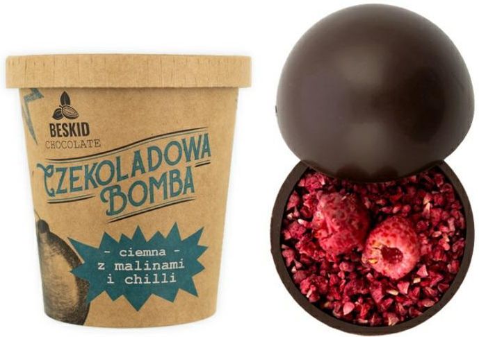 Czekoladowa Bomba ciemna z malinami i chili 50g 5903900334297 Lubisz niespodzianki i fajną zabawę? To świetnie się składa, nasza czekoladowa bomba w kształcie kuli jest dla Ciebie! To nie byle jaka niespodzianka, a jej najlepszy rodzaj – niespodzianka jadalna. Włóż bombę do kubka, zalej gorącym …