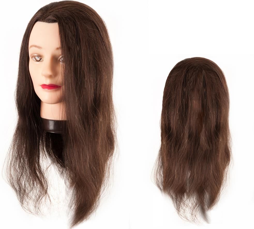 Model fryzjerski główka treningowa włosy naturalne 45-50cm Ref. O00603 Model fryzjerski główka treningowa włosy naturalne 45-50cm Fryzjerska główka treningowa damska przeznaczona do trenowania wszelkich zabiegów fryzjerskich. Dzięki odpowiedniej długości i jakości włosa pozwala w optymalnym stopniu przygotować się do zawodu fryzjera. Model został wykonany z najwyższej jakości materiałów z wykorzystaniem włosów 100% naturalnych europejskich w kolorze brązowym i starannie przymocowanych do główki. Włosy naturalne użyte do produkcji modelu treningowego zachowują się tak samo jak włos na głowie ludzkiej, daje to nieograniczone możliwości wykonywania wszelkich zabiegów, jak farbowanie czy dekoloryzacja. Dla lepszej ergonomii pracy do zestawu został dołączony pasujący uchwyt do przymocowania do blatu lub innego płaskiego podłoża, dzięki czemu główka nie przemieszcza się podczas pracy. Główka fryzjerska przeznaczona jest do trenowania wszelkich zabiegów fryzjerskich m.in.: koloryzacja/dekoloryzacja, trwała, koki, upięcia użycie lokówek, prostownic, suszarek, strzyżenie/golenie. Długość włosa 45-50 cm Główka fryzjerska treningowa włosy naturalne brąz 45-50cm Wysokiej jakości włos naturalny europejski Długość odpowiednia do ćwiczenia wszystkich zabiegów i stylizacji fryzjerskich Doskonała do egzaminu czeladniczego Główka fryzjerska treningowa włosy naturalne brąz 45-50cm przeznaczona do trenowania wszelkich zabiegów fryzjerskich m.in. koloryzacja/dekoloryzacja, trwała, koki, upięcia użycie lokówek, prostownic, suszarek, strzyżenie/golenie.