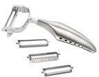 Funkcjonalna obieraczka z wymiennymi ostrzami, która jest wspaniałym udogodnieniem dla szefów kuchni. Innowacyjne narzędzie projektu Komina Yamady posiada trzy różne rodzaje ostrzy: ostrze gładkie do obierania i strugania warzyw oraz twardych owoców – dwustronne ostrze ząbkowane do obierania miękkich owoców – dwustronne ostrze julienne do przygotowywania cienkich paseczków z warzyw oraz twardych owoców W komplecie znajduje się także zapasowe ostrze gładkie. Obieraczka Global jest lekka i doskonale wyważona, co zwiększa jej skuteczność i gwarantuje pełną kontrolę nad narzędziem. Ergonomiczna rękojeść minimalizuje efekt zmęczenia dłoni podczas dłuższej pracy. Wbudowana wypustka do usuwania oczek z ziemniaków pozwala szybko oczyścić warzywa. Materiał – najwyższej jakości stal nierdzewna 18/10 w wykończeniu satynowym Długość ostrza – 5 cm Noże Global słyną z łączenia fenomenalnej skuteczności z eleganckim designem. Są lekkie i doskonale wyważone, a ich cienkie, twarde i wytrzymałe klingi zachowują idealną ostrość przez długi czas. Dzięki jednolitej konstrukcji noże są higieniczne, lepiej leżą w dłoni i łatwiej jest je wyczyścić czy naostrzyć. Indywidualnie wyważana rękojeść została tak skonstruowana, by redukować zmęczenie i nie wyślizgiwać się z rąk. Noże Global, zaprojektowane w 1985 r. przez Komina Yamadę, zdobyły wiele międzynarodowych nagród i cieszą się niesłabnącym uznaniem największych mistrzów kuchni – zarówno profesjonalistów, jak i kuchmistrzów domowych.