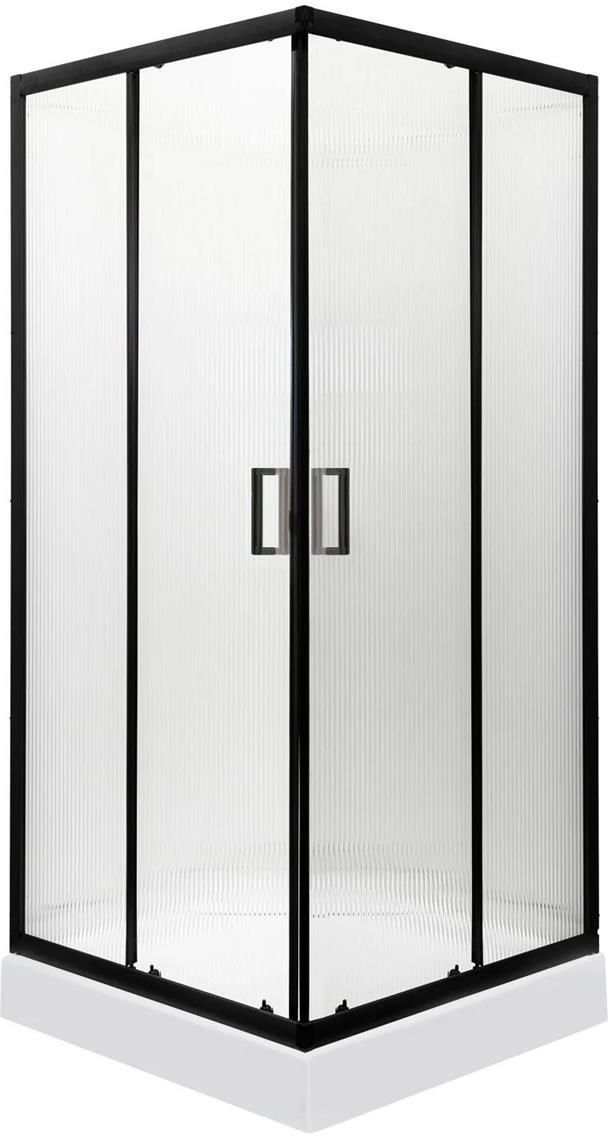 Kabina prysznicowa Czarna Soho SQ 90x90 cn Szkło ornamentowe „ryflowane” w Komplecie z POLSKIM brodzikiem akrylowym O wys. 15 cm w kolorze białym i syfonem w Kolorze czarnym DANE TECHNICZNE KABINY Wymiary 90 × 90 × 205 cm (wysokość z brodzikiem) Profile – aluminiowe, czarne Szkło – 6 mm, hartowane, ornamentowe „ryflowane” Drzwi – dwuskrzydłowe, przesuwne DANE TECHNICZNE BRODZIKA Kolor – biały Materiał wykonania – akryl sanitarny Rozmiar – 80 × 80 cm, Wysokość – 15 cm W komplecie z nóżkami Brodzik jest zabudowany z każdej strony (posiada 4 ścianki) W komplecie z brodzikiem syfon z pokrywą w kolorze czarnym (syfon nie wymaga wpuszczenia w posadzkę) Syfon brodzikowy z nakładanym korkiem Speed fi 50, w kolorze czarnym.