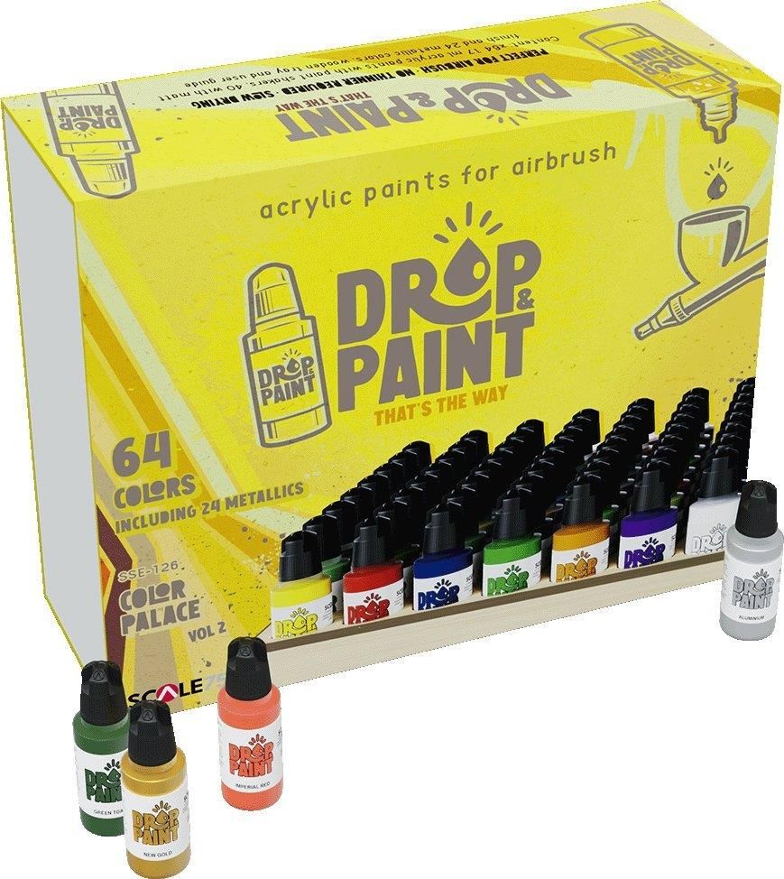 Dzięki temu zestawowi pomalujesz wszystko aerografem! Czym jest Drop & Paint? Nie często w świecie modelarstwa jesteśmy świadkami prawdziwej rewolucji, co sprawia, że linia Drop & Paint producenta Scale 75 wzbudza jeszcze większy podziw. Drop & Paint to spełnienie marzeń każdego fana malowania aerografem, gdyż została stworzona z myślą o rozwiązaniu wszystkich problemów związanych z tym medium. Drop & Paint to zupełnie nowa akrylowa, zaprojektowana w celu ulepszenia i uproszczenia pracy z aerografem, bez względu na Twój stopień zaawansowania. Zapomnij o zatorach, pomiarach, obliczaniu proporcji, mieszaniu i żmudnych sesjach czyszczenia aerografu – Drop & Paint można używać na wszystkich materiałach i nie trzeba ich rozcieńczać żadnym innym produktem. Dowiedz się więcej o Drop & Paint oglądając materiał producenta. Scale 75: Drop Paint - Color Palace Vol. 1 Color Palace to zestaw, który zadowoli nawet najbardziej wymagającego modelarza, zawierając połowę odcieni farbek z serii Drop & Paint – wraz z tym prawie wszystkie metaliczne farbki – co pozwoli Ci nie martwić się o to, że zabraknie Ci jakiegoś koloru – dzięki Color Palace Vol. 2, możesz namalować wszystko, co Ci się wymarzy!