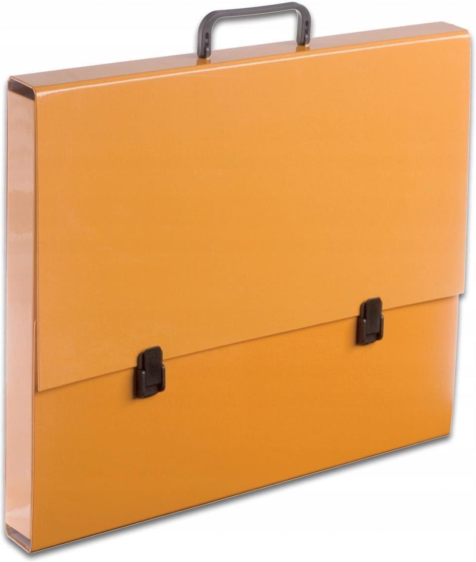 Teczka wykonana z tektury 1,7mm. Okleina uszlachetniona folią polipropylenową. Nitowane boki z okleinowanymi krawędziami. Wymiary w cm: 46 x 38 x 5,5. Kolor pomarańczowy pastelowy. Opakowanie: blister