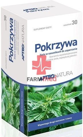 Pokrzywa APTEO NATURAto suplement diety. Zastosowanie: Polecany dla osób z problemami z dróg moczowych oraz z niską odpornością. Przeciwwskazania: Nie stosować przy nadwrażliwości na którykolwiek ze składników preparatu. Działanie: Napar z liści pokrzywy korzystnie wpływa na procesy oczyszczania i wzmacniania organizmu, wspomaganie układu odpornościowego, prawidłową pracę serca i układu oddechowego. Skład: 1 saszetka zawiera 1,5 g wysuszonych i rozdrobnionych liści pokrzywy zwyczajnej. Zawartość opakowania: 30 saszetek. Zalecana porcja: 1-2 saszetki dziennie przez okres do 4 tygodni. Podmiot odpowiedzialny: Synoptis Pharma, ul. Krakowiaków 65, 02-255 Warszawa, Polska. Informacja o produkcie: Synoptis Pharma, ul. Krakowiaków 65, 02-255 Warszawa, Polska. Informacje dodatkowe: Suplement diety nie może być stosowany jako substytut zróżnicowanej diety. Nie należy przekraczać zalecanej do spożycia porcji w ciągu dnia. Przed zastosowaniem suplementu diety należy sprawdzić datę ważności podaną na opakowaniu (etykiecie). Nie należy go stosować po terminie ważności. Przechowuj preparat w miejscu niedostępnym i niewidocznym dla dzieci, zgodnie z wymogami producenta. Przed użyciem zapoznaj się z ulotką dołączoną do opakowania, która zawiera wskazania, przeciwwskazania, dane dotyczące działań niepożądanych i dawkowanie oraz informacje dotyczące stosowania i przechowywania produktu leczniczego, bądź skonsultuj się z lekarzem lub farmaceutą, gdyż każdy lek niewłaściwie stosowany zagraża Twojemu życiu lub zdrowiu.