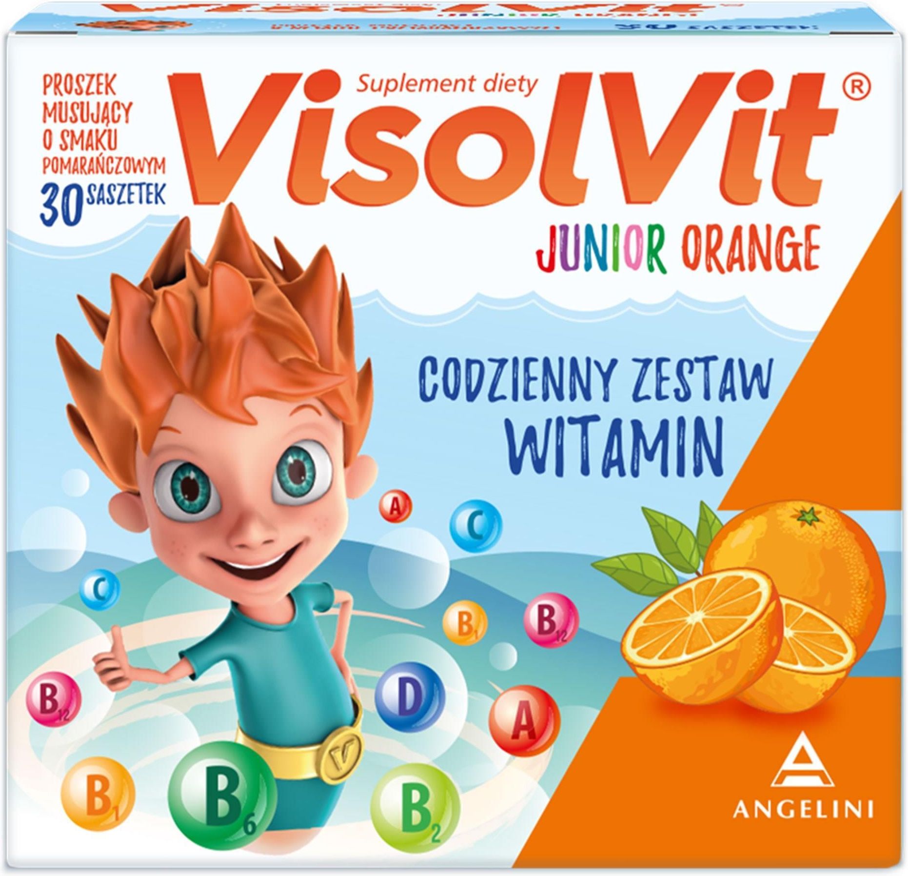 VisolVit Junior Orange, witaminy dla dzieci po 3 r.ż., musujący proszek o smaku pomarańczowym, 30 saszetek VisolVit Junior Orange, musujący proszek – opis produktu: VisolVit Junior Orange to suplement diety zawierający codzienny zestaw 9 witamin. Musujący proszek VisolVit zawiera witaminy ważne jako wsparcie w okresie intensywnego wzrostu i rozwoju dla dzieci po 3. roku życia i dla młodzieży. Preparat zawiera dużą porcję witaminy D – witaminy słońca niezbędnej w okresie jesienno-zimowym, która pomaga w utrzymaniu zdrowych kości i wspiera odporność Twojego dziecka. Suplement diety z witaminami dla dzieci VisolVit Junior Orange zawiera barwniki naturalnego pochodzenia, jest bez konserwantów i glutenu. 1 saszetka dziennie wspomaga odporność i prawidłowy rozwój dziecka po 3. roku życia. Specjalnie skomponowany zestaw witamin w suplemencie diety VisolVit Junior Orange sprawia, że produkt jest szczególnie zalecany: w okresie intensywnego wysiłku fizycznego i umysłowego w okresie wzmożonego zapotrzebowania na witaminy, szczególnie w okresie jesienno-zimowym jako wsparcie odporności – dzięki zawartości witamin C i D proszek VisolVit Junior Orange pomaga w prawidłowym funkcjonowaniu układu odpornościowego. Visolvit Junior Orange to musujący granulat do przygotowania napoju o pomarańczowym smaku. Wystarczy rozpuścić zawartość saszetki w chłodnej wodzie.  Musujący proszek Visolvit Junior Orange – właściwości składników wspierających prawidłowy rozwój i odporność każdego dziecka: Witamina C wspomaga prawidłowe funkcjonowanie układu odpornościowego, zwiększa przyswajanie żelaza, a także wspiera prawidłową produkcję kolagenu w celu zapewnienia prawidłowego funkcjonowania chrząstki, dziąseł i zębów.  Witamina D pomaga w prawidłowym wchłanianiu wapnia i fosforu, a także pomaga w utrzymaniu zdrowych kości. Witamina B12 pomaga w prawidłowej produkcji czerwonych krwinek, wspiera prawidłowe funkcjonowanie układu nerwowego, utrzymanie prawidłowego metabolizmu homocysteiny oraz utrzymanie prawidłowych funkcji psychologicznych.  Witamina A pomaga w utrzymaniu prawidłowego widzenia oraz w utrzymaniu prawidłowego stanu błon śluzowych. Niacyna (witamina B3) pomaga utrzymać prawidłowe funkcjonowanie układu nerwowego, przyczynia się do zmniejszenia uczucia zmęczenia i znużenia. Kwas pantotenowy (witamina B5) przyczynia się do prawidłowej syntezy i metabolizmu hormonów sterydowych, witaminy D i niektórych neuroprzekaźników, pomaga w utrzymaniu sprawności umysłowej na prawidłowym poziomie. VisolVit Junior Orange musujący granulat - skład zalecanej dziennej porcji do spożycia:   *RWS - % Referencyjnej Wartości Spożycia Składniki: cukier, regulator kwasowości – kwas winowy (L(+)-), regulator kwasowości – węglany sodu (wodorowęglan sodu), kwas L-askorbinowy, substancja przeciwzbrylająca – dwutlenek krzemu, zagęszczony sok pomarańczy w proszku, zagęszczony sok z buraka czerwonego w proszku, aromat pomarańczowy z barwnikiem w proszku (w tym barwnik: karoteny), barwnik – karoteny, amid kwasu nikotynowego, palmitynian retinylu, cyjanokobalamina, cholekalcyferol, regulator kwasowości – węglany sodu (węglan sodu), D-pantotenian wapnia, chlorowodorek tiaminy, chlorowodorek pirydoksyny, ryboflawina. Sposób użycia: Zalecana do spożycia dzienna porcja produktu wynosi: dzieci powyżej 3. roku życia i młodzież – 1 saszetka.  Zawartość saszetki rozpuścić w ½ szklanki schłodzonej przegotowanej wody. Nie należy przekraczać zalecanej porcji do spożycia w ciągu dnia – 1 saszetki. Ostrzeżenia / środki ostrożności: Preparatu nie należy stosować przy nadwrażliwości na którykolwiek z jego składników.  Suplementy diety nie mogą być stosowane jako substytut (zamiennik) zróżnicowanej diety. Podstawą prawidłowej diety jest zrównoważony i zróżnicowany sposób odżywiania. Nie należy przekraczać zalecanej porcji dziennej. Przechowywanie: Produkt przechowywać w temperaturze poniżej 25C. Chronić od wilgoci.  Suplementy diety powinny być przechowywane w sposób niedostępny dla małych dzieci. Producent: Angelini Pharma Polska Sp. z o.o. Aleje Jerozolimskie 181B 02-222 Warszawa Klauzula dla suplementów diety: Suplement diety nie może być stosowany jako substytut zróżnicowanej diety. Zrównoważony sposób odżywiania i zdrowy tryb życia są istotne dla prawidłowego funkcjonowania organizmu. Przechowywać w temperaturze pokojowej, w sposób niedostępny dla małych dzieci.