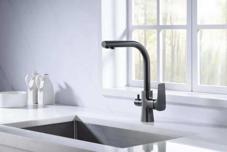Blue Water Tivoli Grafit OPIS BATERIA Z PODŁĄCZENIEM DO WODY FILTROWANEJ – wykończenie: GRAFIT (GUN METAL) – wylewka obrotowa do 360° – głowice ceramiczne – 2 elastyczne wężyki podłączeniowe 3/8“ – 400 mm – 1 wężyk podłączeniowy do filtra 1/2” – 400 mm z szybkozłączką – 2 perlatory   BATERIA Z DWOMA NIEZALEŻNYMI OBWODAMI: – mieszacz wody ciepłej i zimnej (prawa strona) – podłączenie do wody filtrowanej (lewa strona)